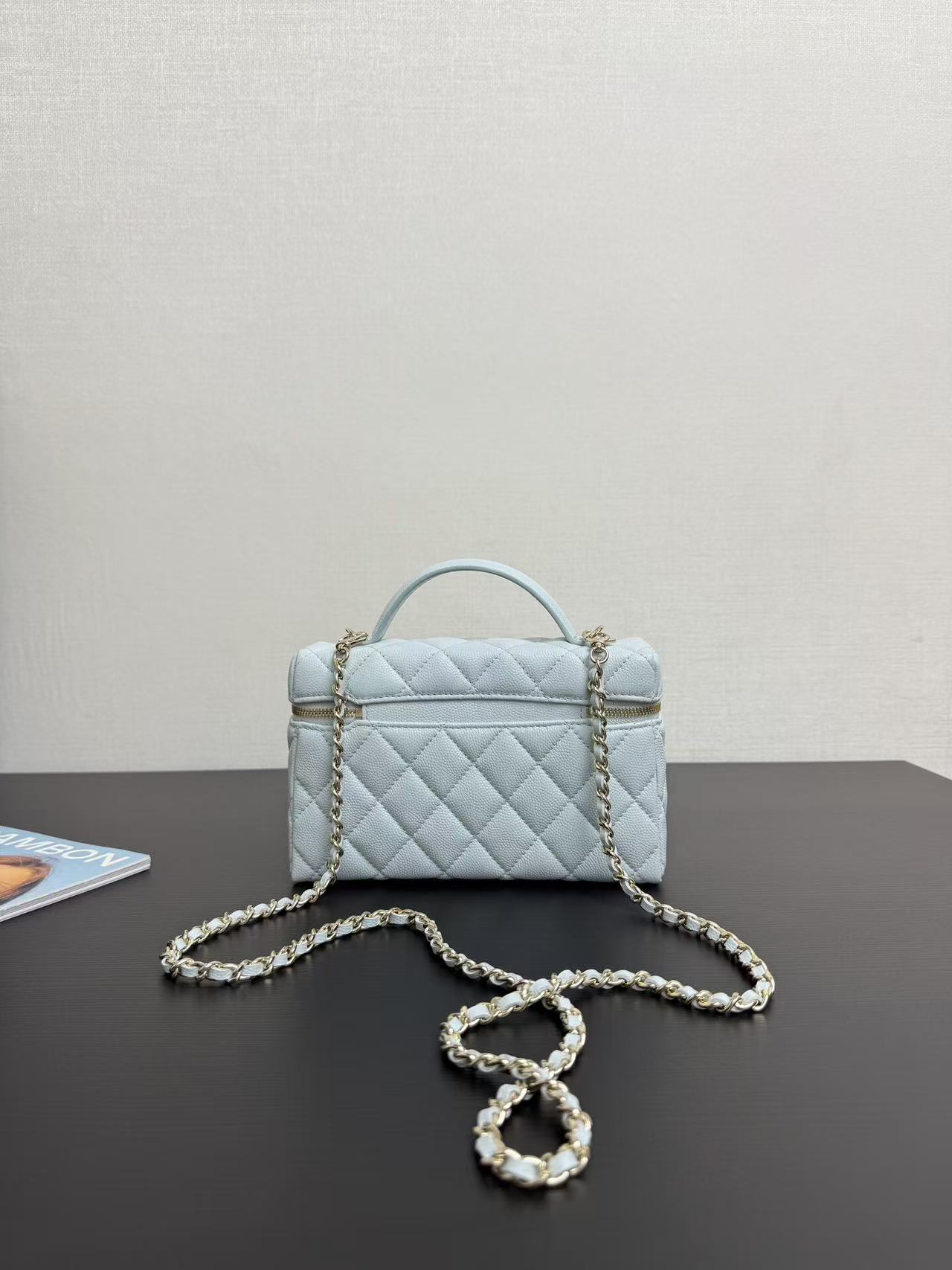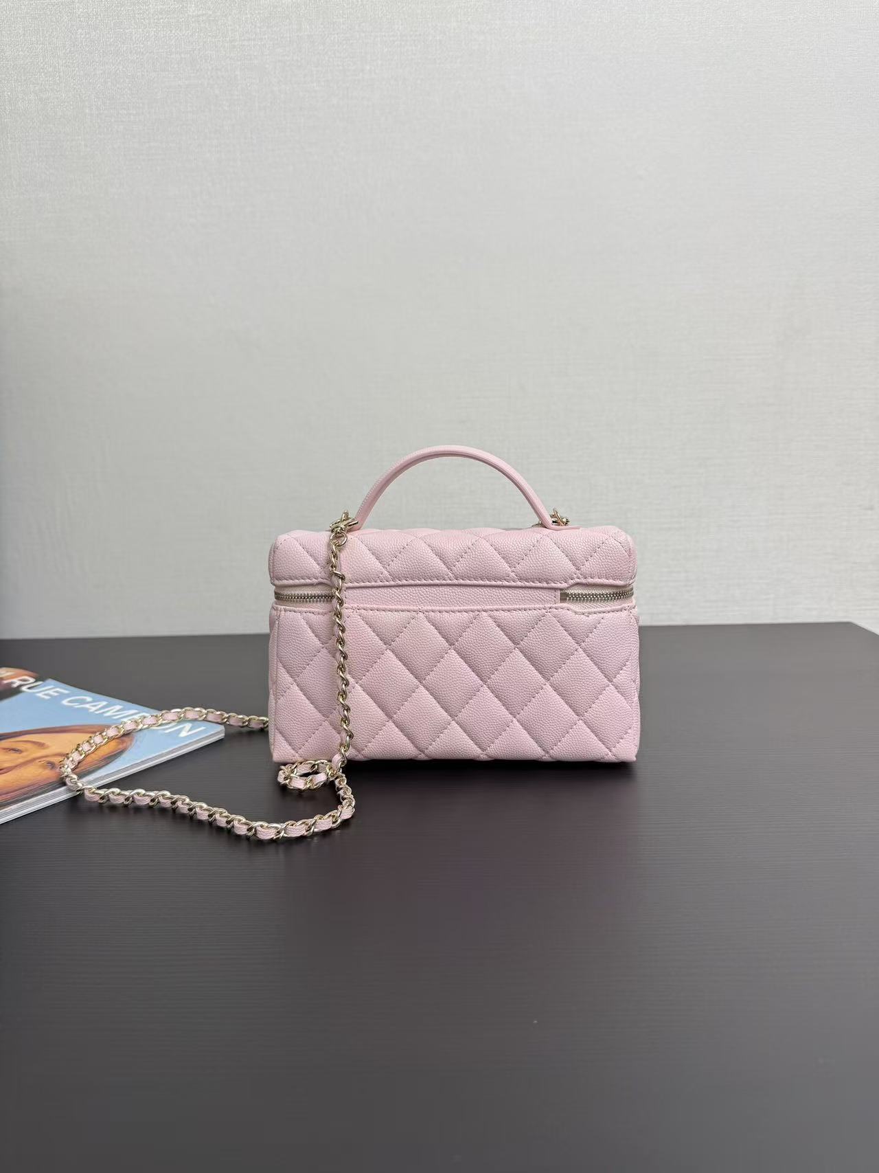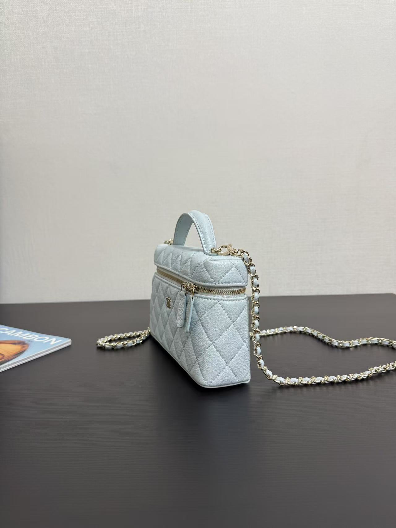 Light gold buckle, pebbled leather, very spacious, and beautiful, every design is my favorite! The compact size makes it perfect for everyday travel. The simple and elegant logo design on the handles not only makes it stylish, but also has a well-structured interior. At 19cm, it's slightly wider than current box bags, easily fitting a large phone! This bag looks great whether carried by hand or worn crossbody! The chain is detachable.