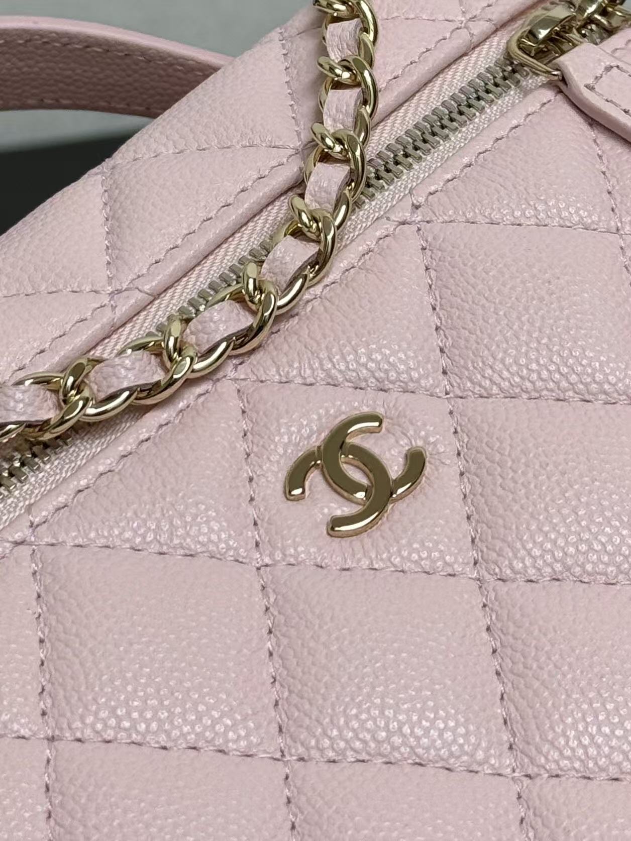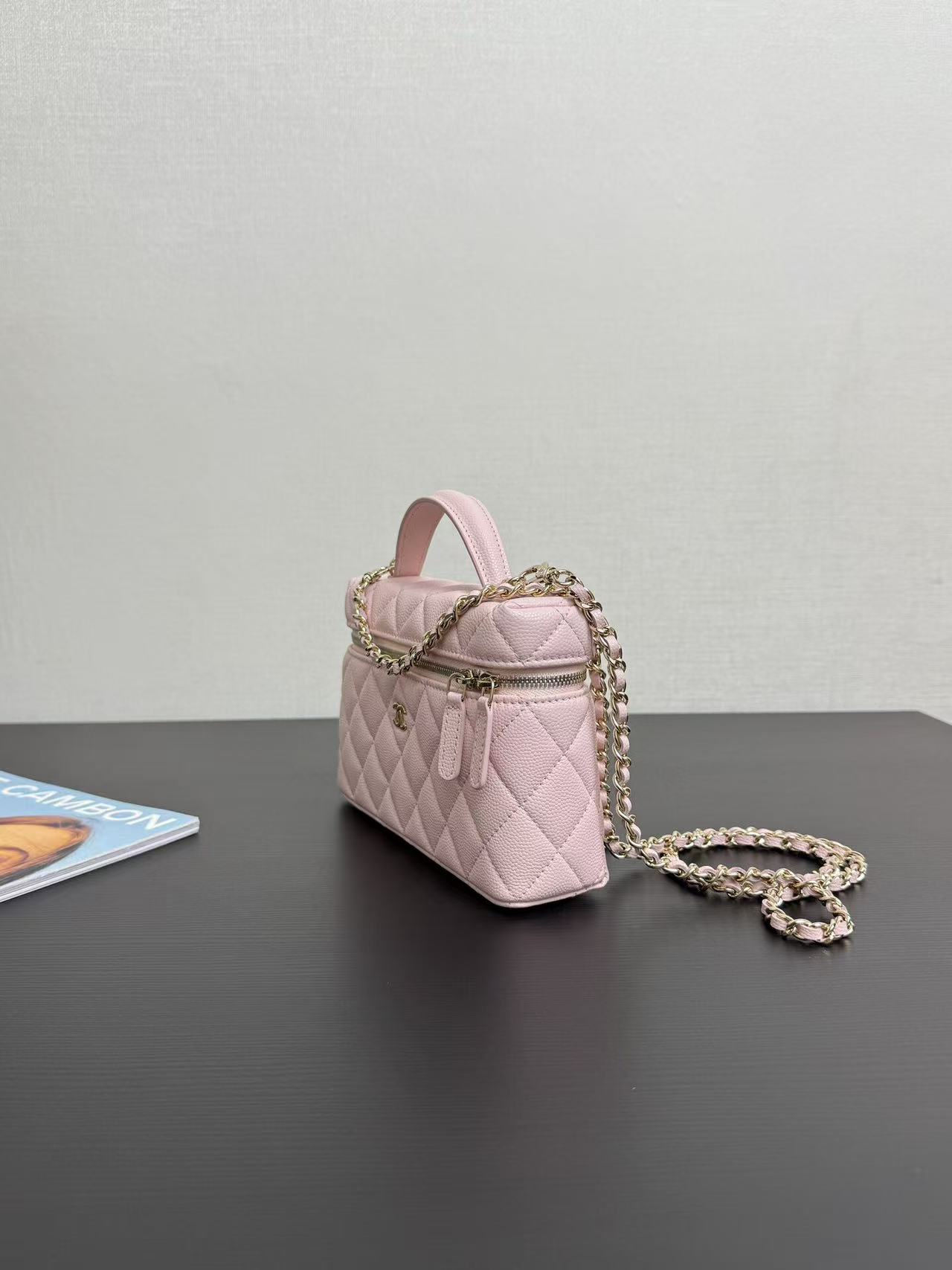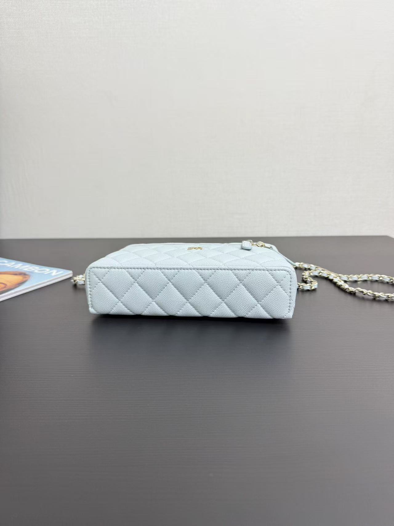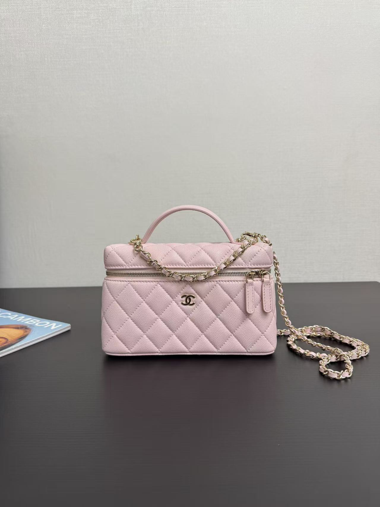 Light gold buckle, pebbled leather, very spacious, and beautiful, every design is my favorite! The compact size makes it perfect for everyday travel. The simple and elegant logo design on the handles not only makes it stylish, but also has a well-structured interior. At 19cm, it's slightly wider than current box bags, easily fitting a large phone! This bag looks great whether carried by hand or worn crossbody! The chain is detachable.