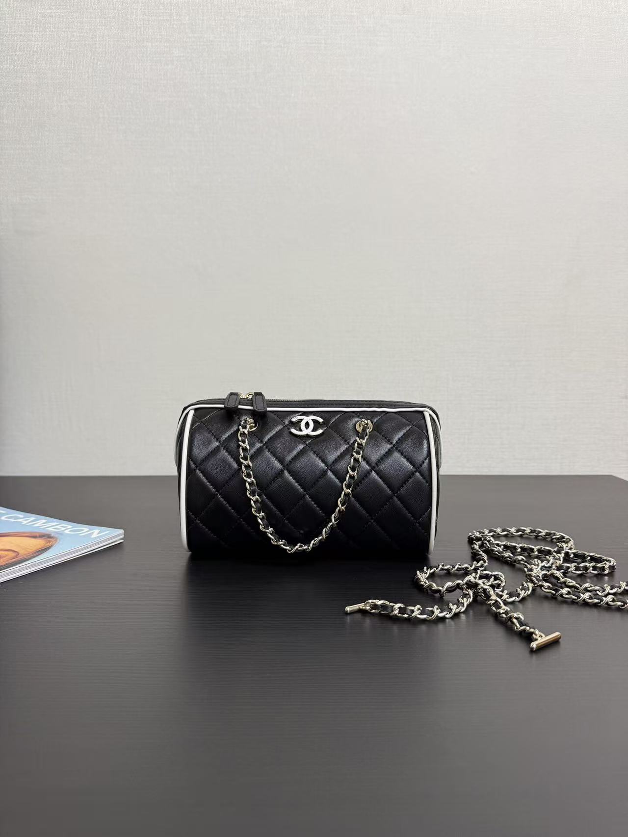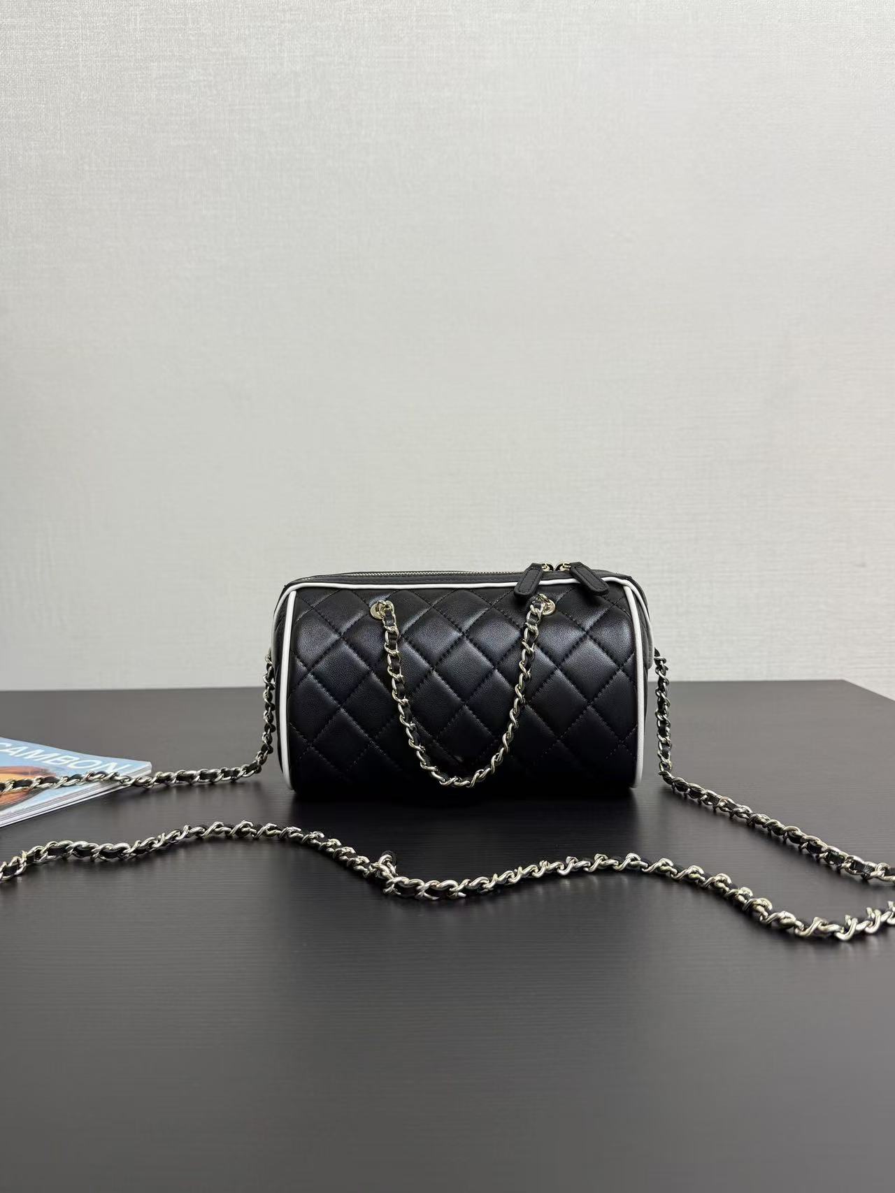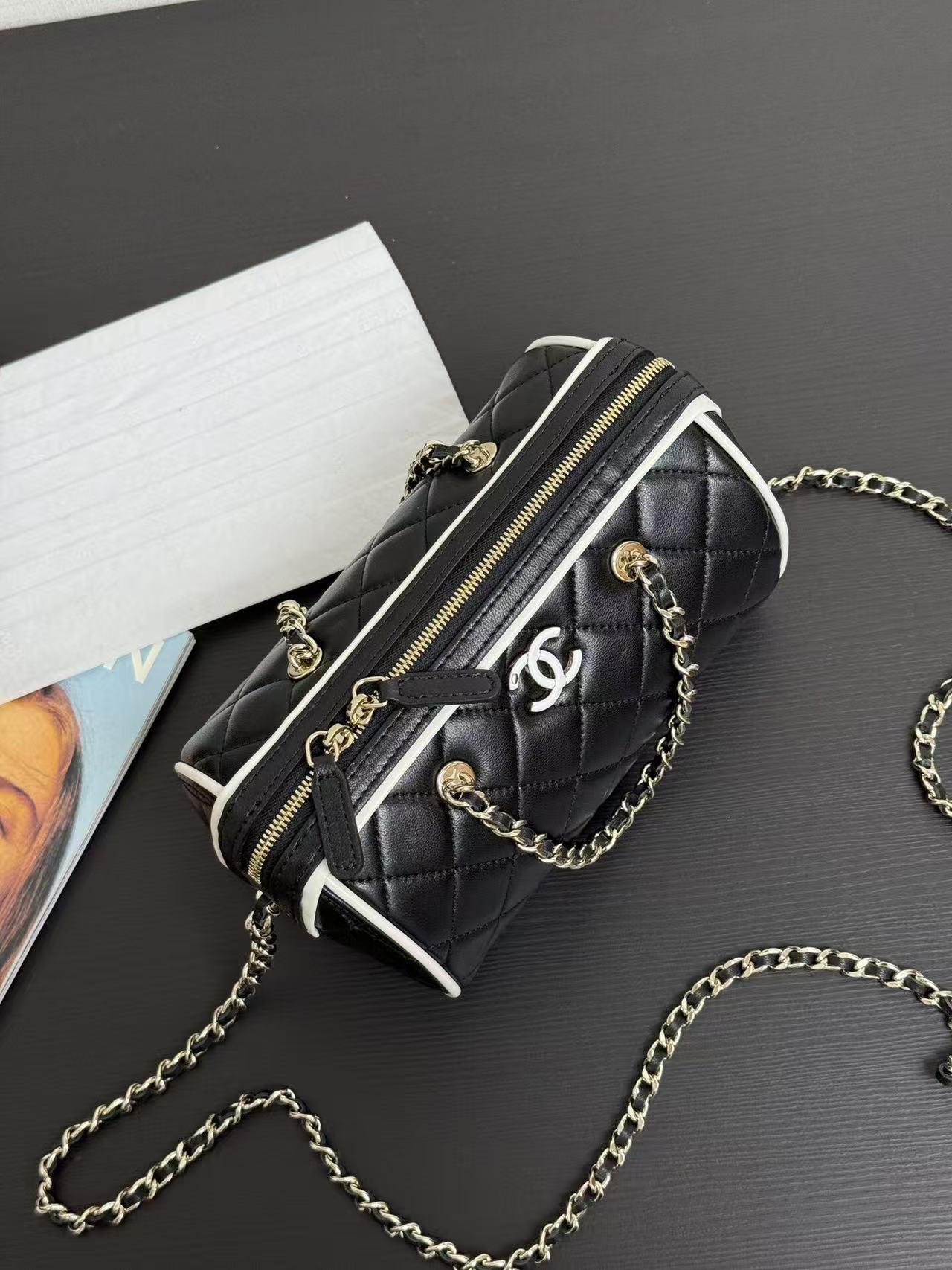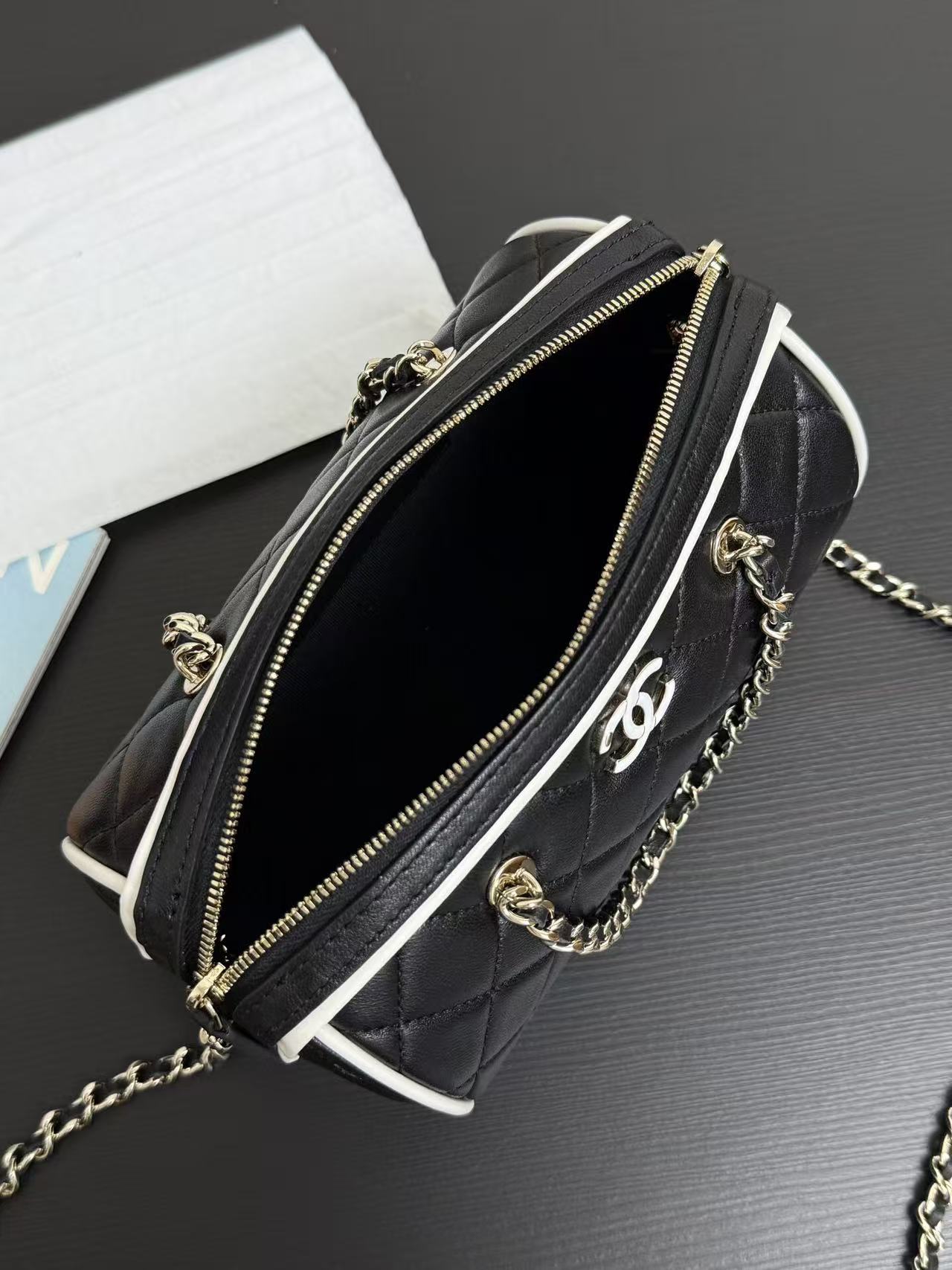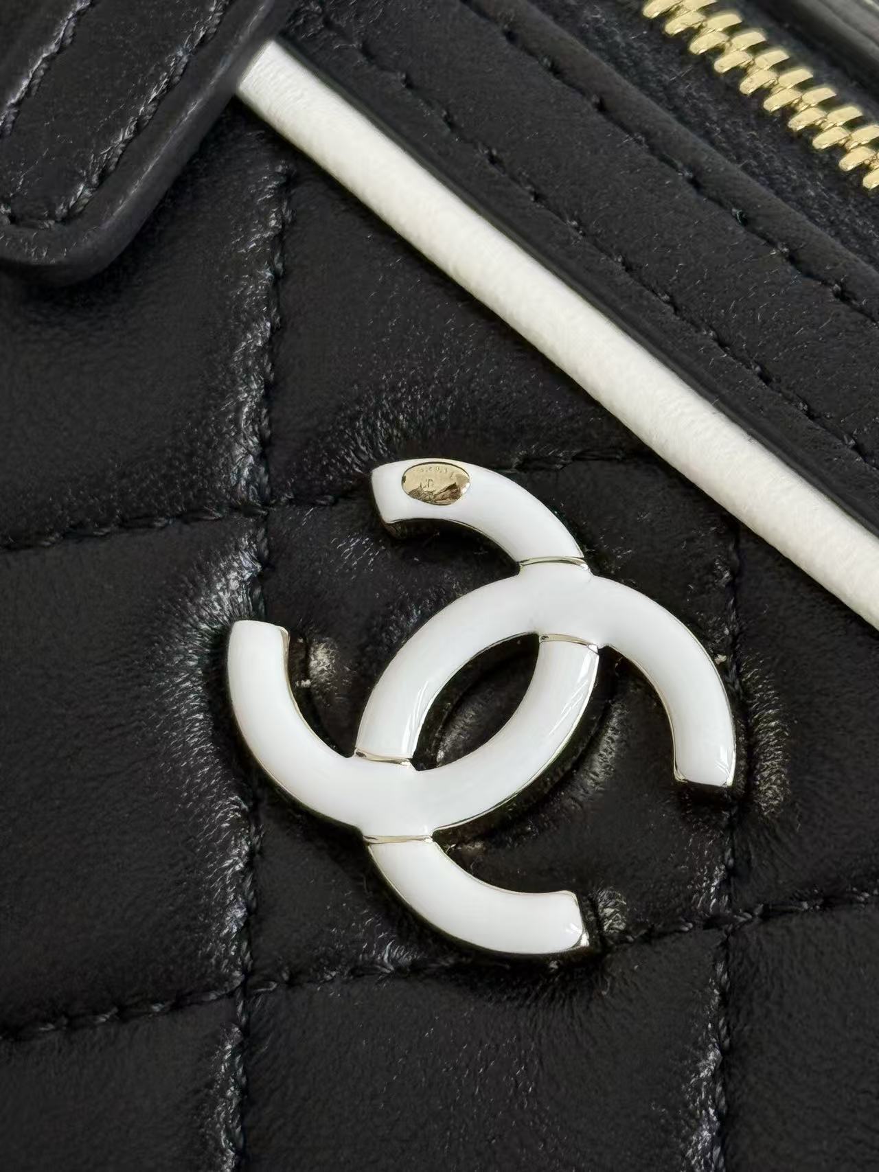 Chanel 25P mini bowling bag in black and gold, model number 99460Dimensions: 11.5 x 18.5 x 11cm