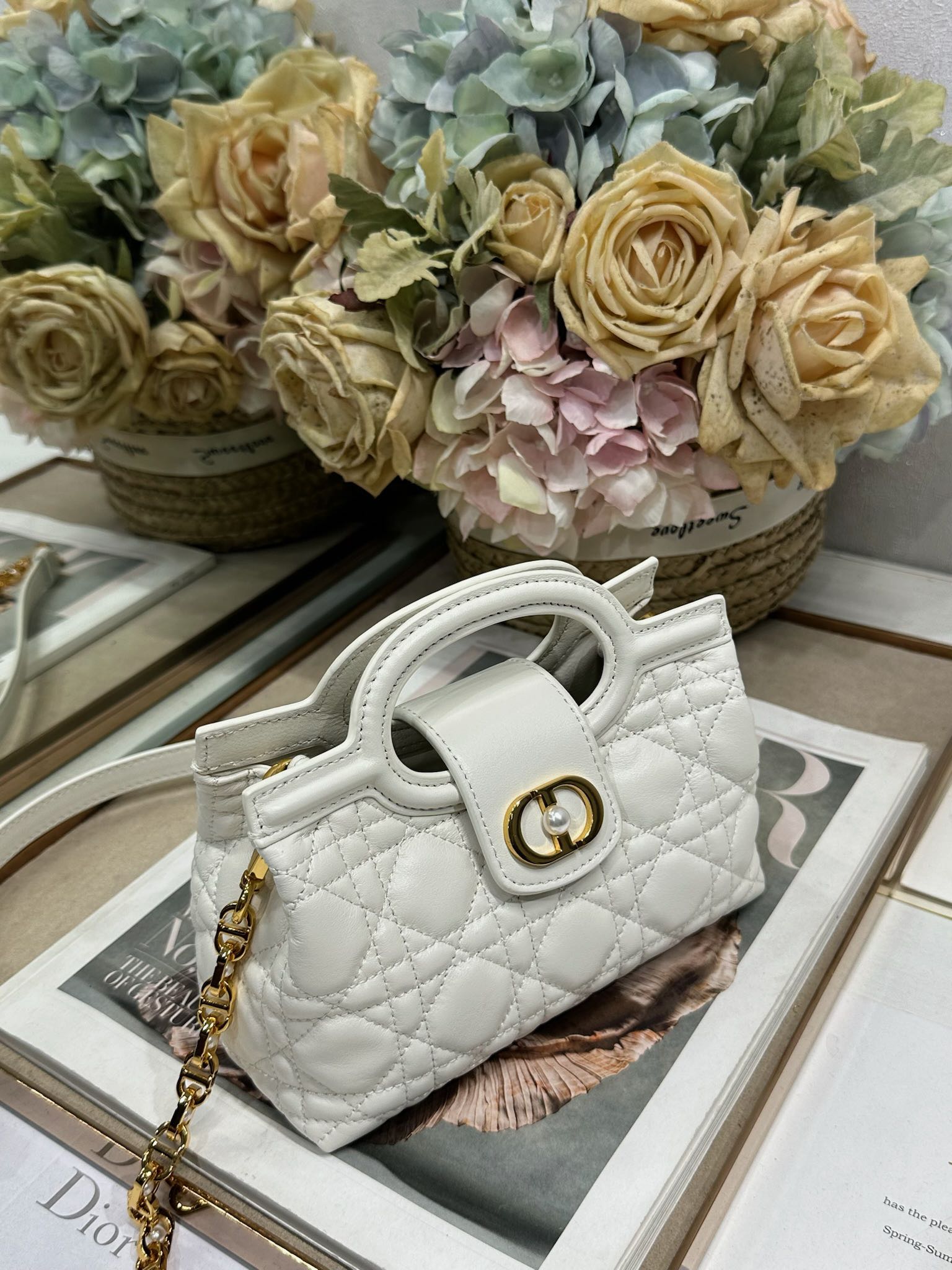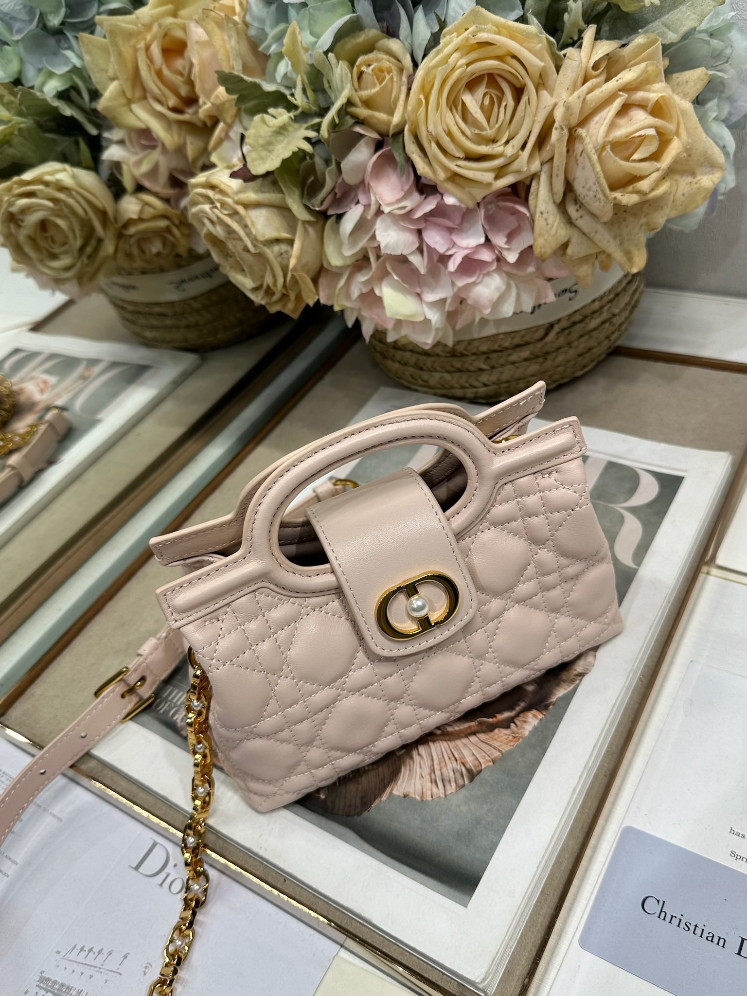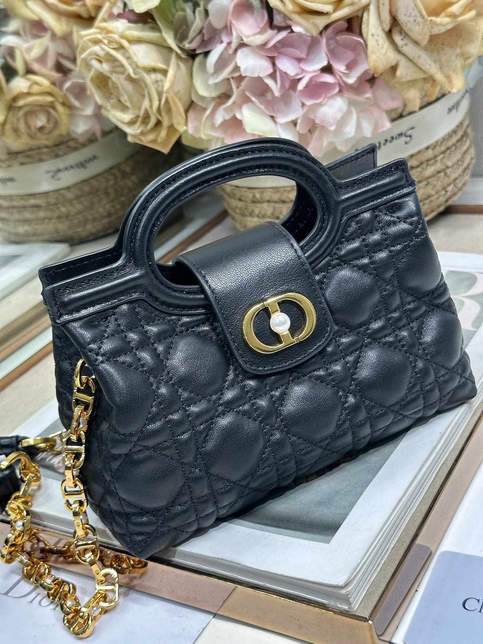 This Dior Jolie Top Handle mini chain handbag is a new addition to the 2026 Early Spring Ready-to-Wear collection, showcasing an elegant and sophisticated design. Crafted from black lambskin leather with a cannage pattern, the flap is adorned with a gold-finished metal CD logo and white resin beads. The interior features a single compartment for everyday essentials. It comes with double top handles and an adjustable, detachable CD chain shoulder strap, composed of leather strap and CD chain links, embellished with white resin beads. It can be comfortably carried by hand, over the shoulder, or crossbody, complementing both casual and evening looks.