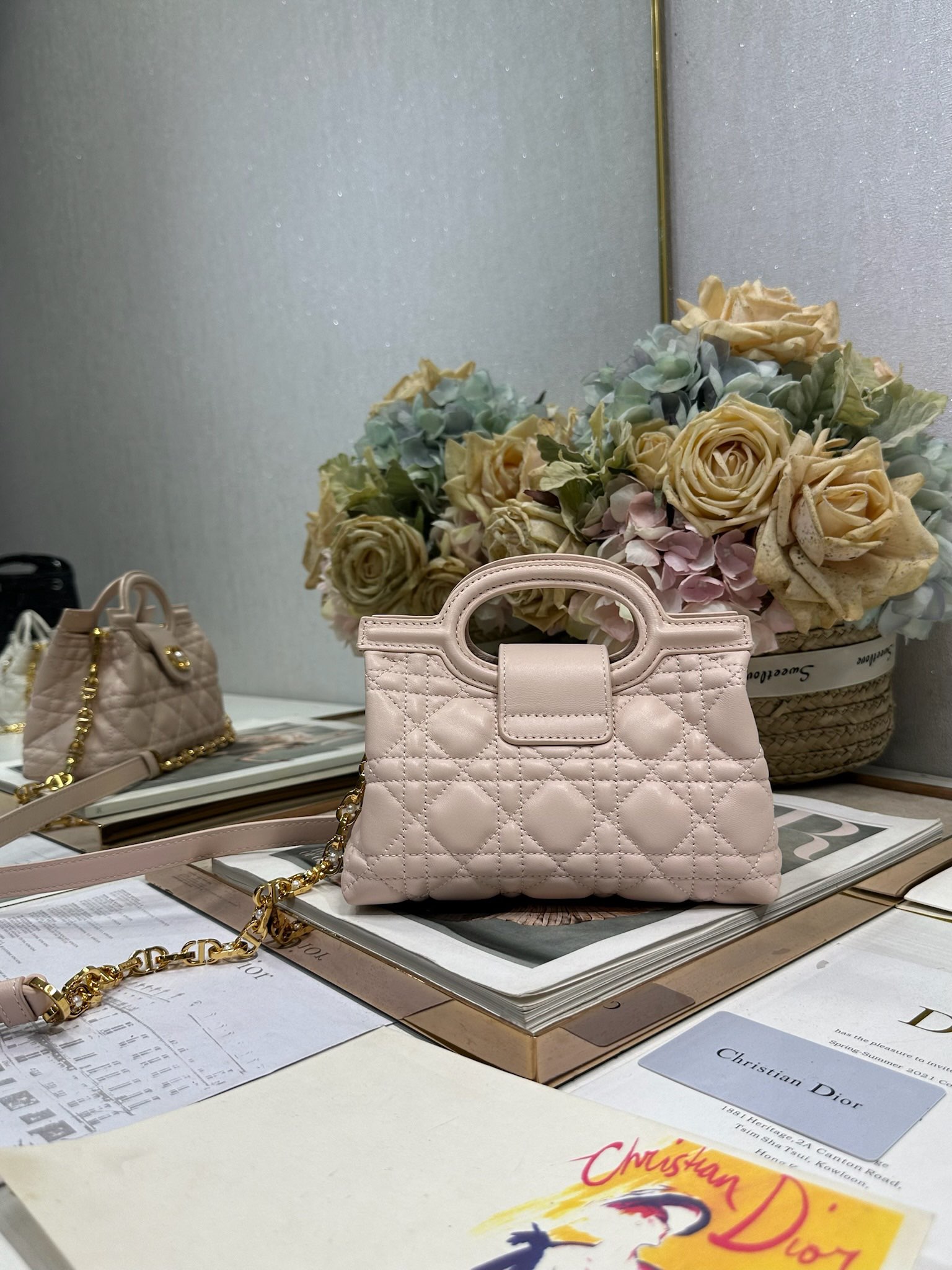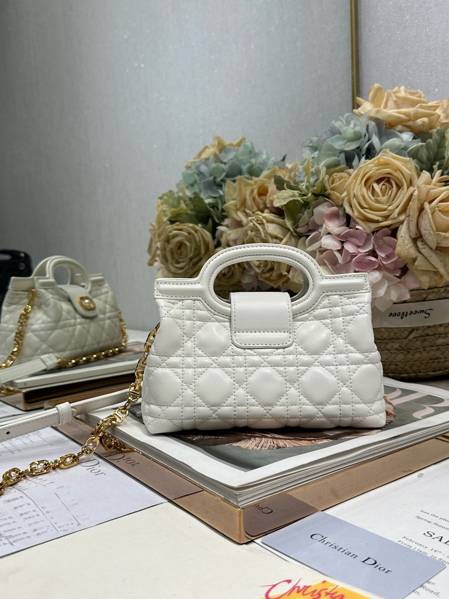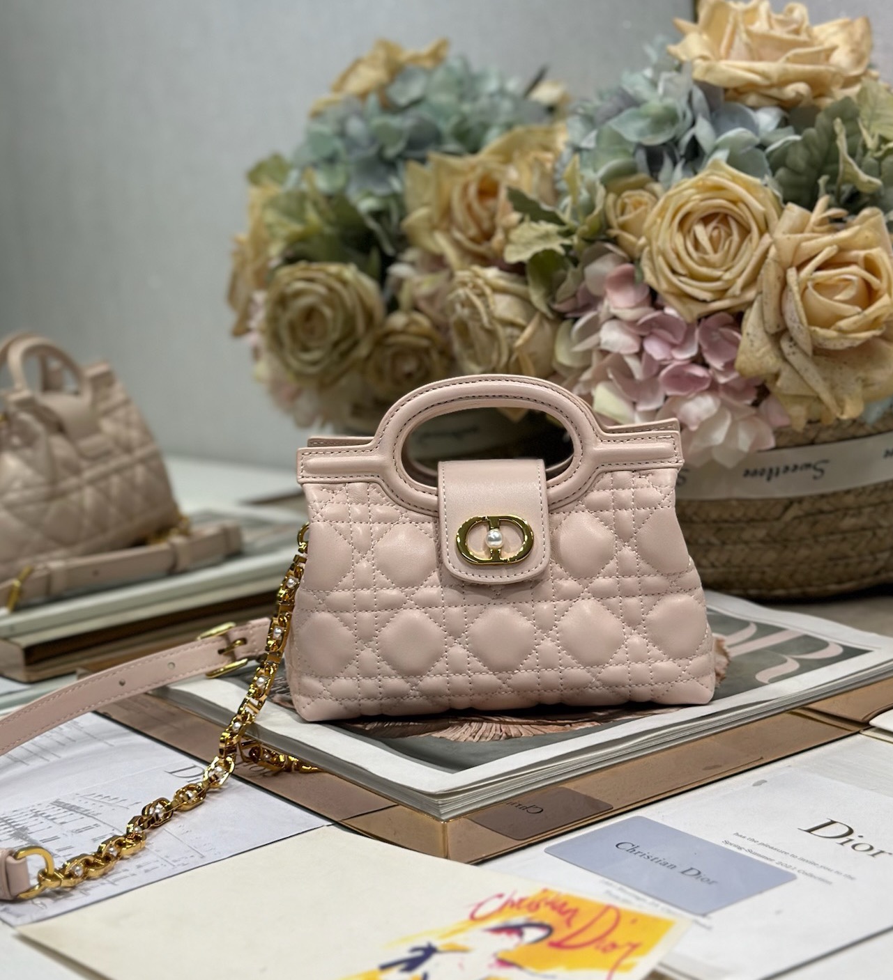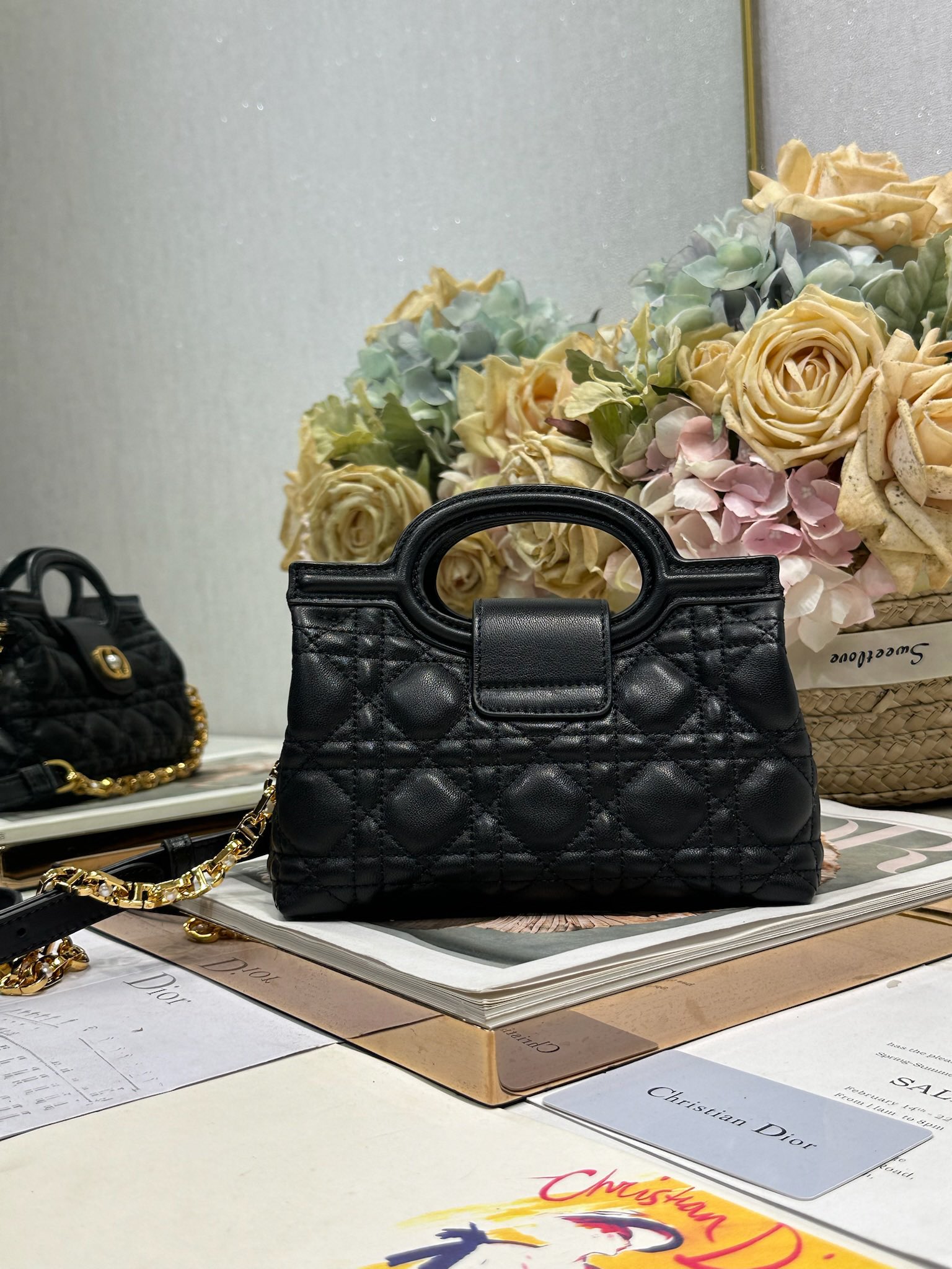 This Dior Jolie Top Handle mini chain handbag is a new addition to the 2026 Early Spring Ready-to-Wear collection, showcasing an elegant and sophisticated design. Crafted from black lambskin leather with a cannage pattern, the flap is adorned with a gold-finished metal CD logo and white resin beads. The interior features a single compartment for everyday essentials. It comes with double top handles and an adjustable, detachable CD chain shoulder strap, composed of leather strap and CD chain links, embellished with white resin beads. It can be comfortably carried by hand, over the shoulder, or crossbody, complementing both casual and evening looks.