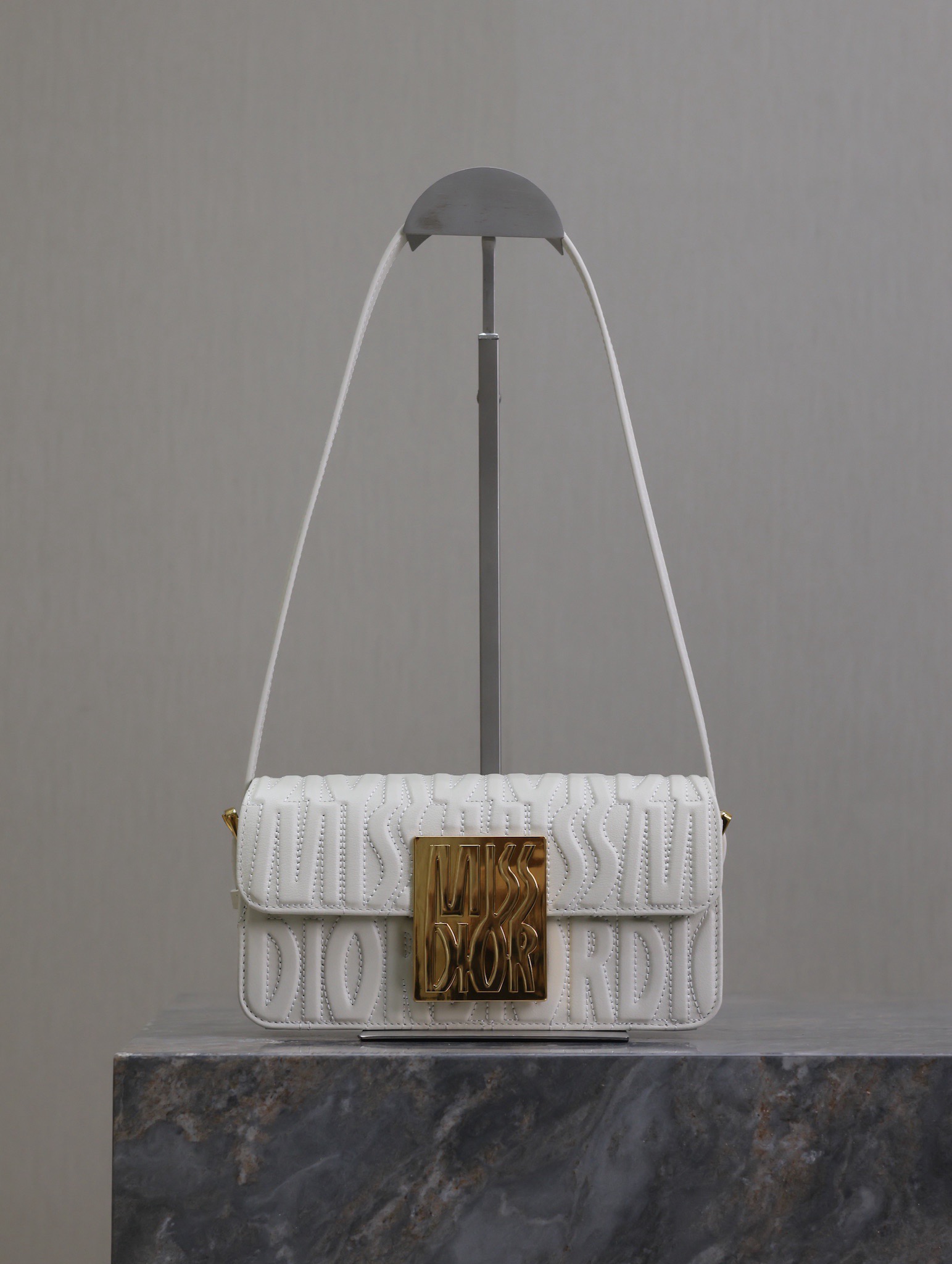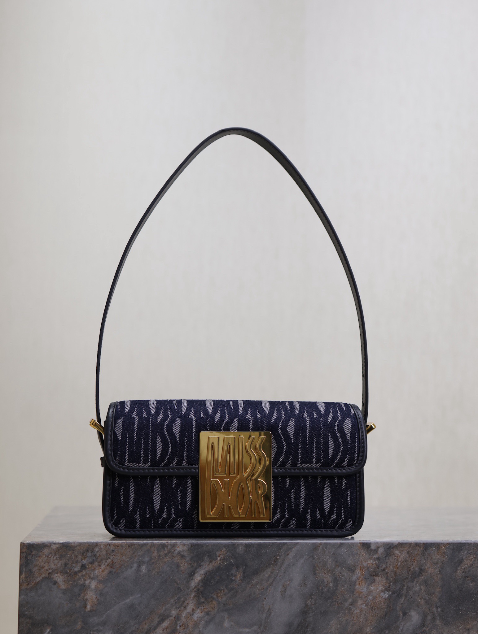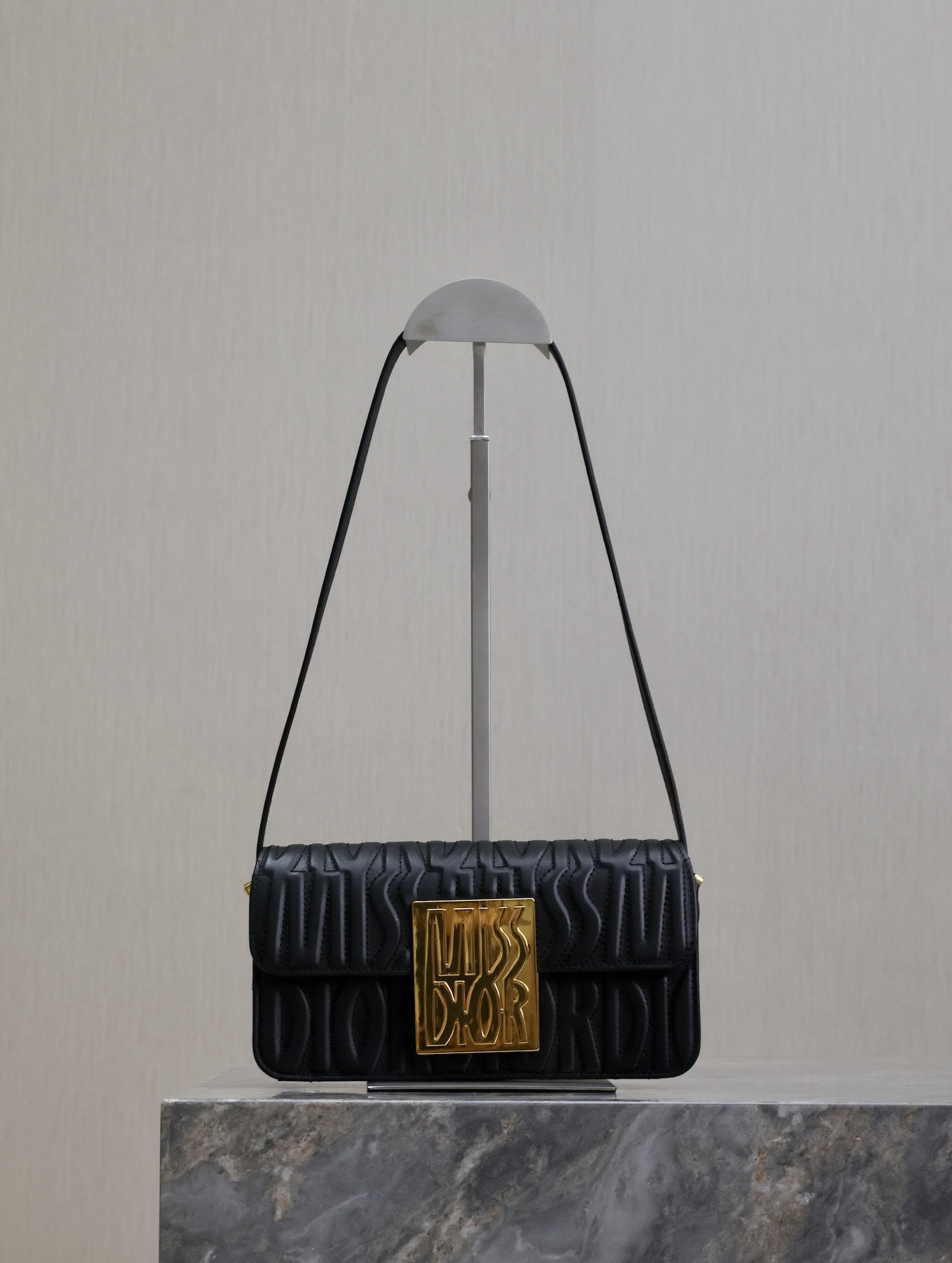 This Miss Dior flap handbag debuted at the Dior Fall/Winter 2024 ready-to-wear collection, reinterpreting the classic Dior style with modern elegance. Crafted from black quilted calfskin, it features the collection's iconic Miss Dior Allover pattern, inspired by Marc Bohan's Dior design archives, offering a modern take on 1960s fashion. A contrasting vintage gold-finish metal plaque adorned with the Miss Dior logo showcases its timeless aesthetic. The main compartment beneath the flap features a zippered pocket for easy storage of everyday essentials. With an adjustable strap, it can be carried over the shoulder for a couture-inspired look.