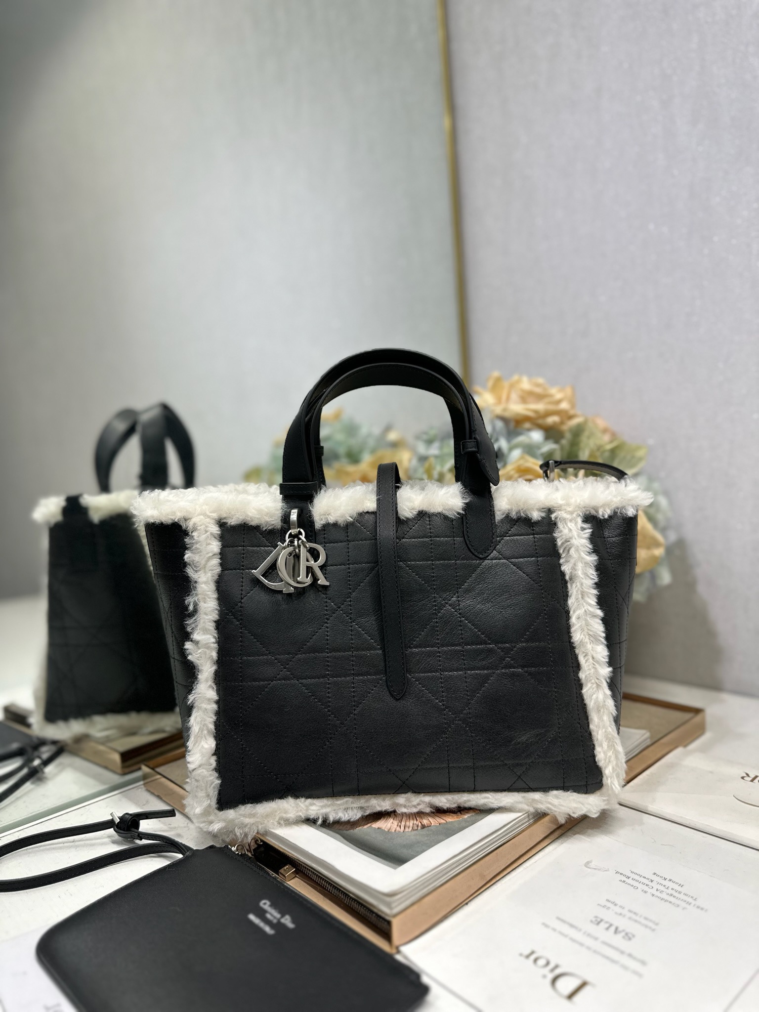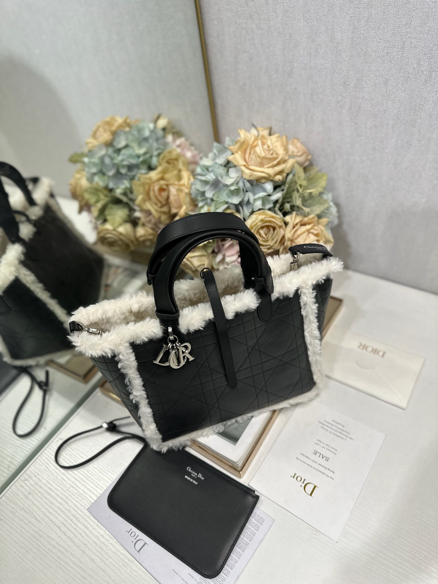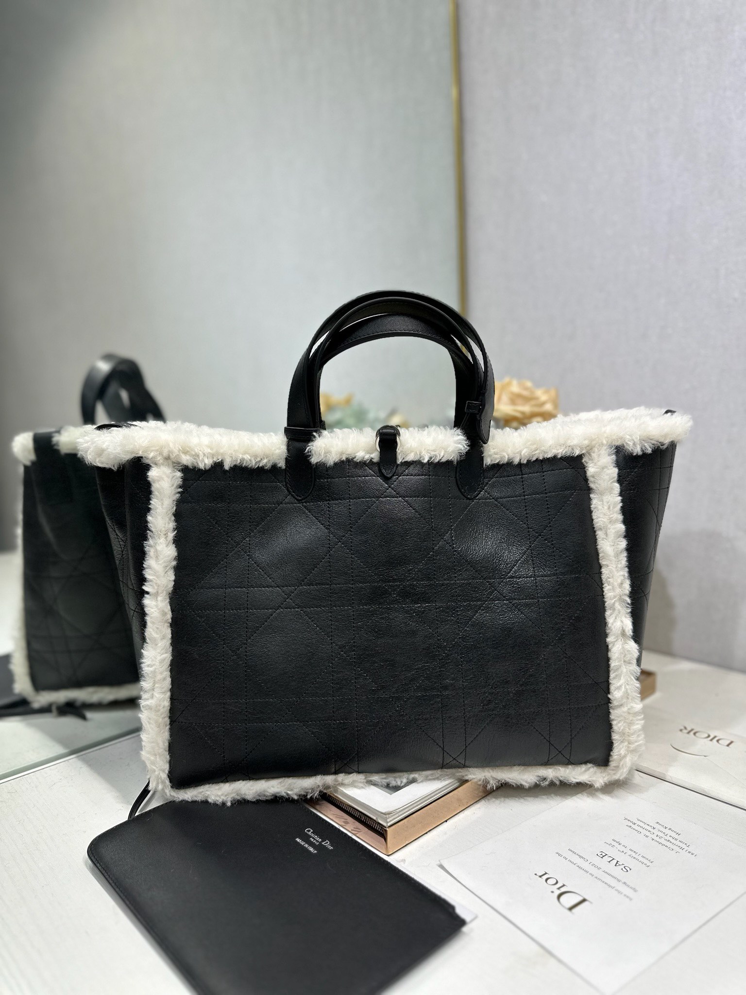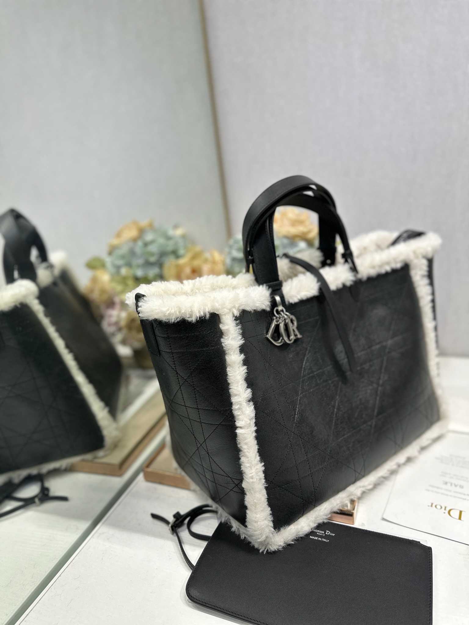 This Dior Toujours handbag made a stunning debut in the Winter 2024 collection, boasting a unique blend of casual and practical design. Crafted from meticulously cut cracked black calfskin with oversized cannage stitching, its spacious interior features compartments and small pockets for neatly organizing everyday essentials. It features a leather drawstring closure for secure storage, and a CD Lock D-shaped knob closure with adjustable sides for added style. The large size includes an adjustable leather handle for easy carrying.
