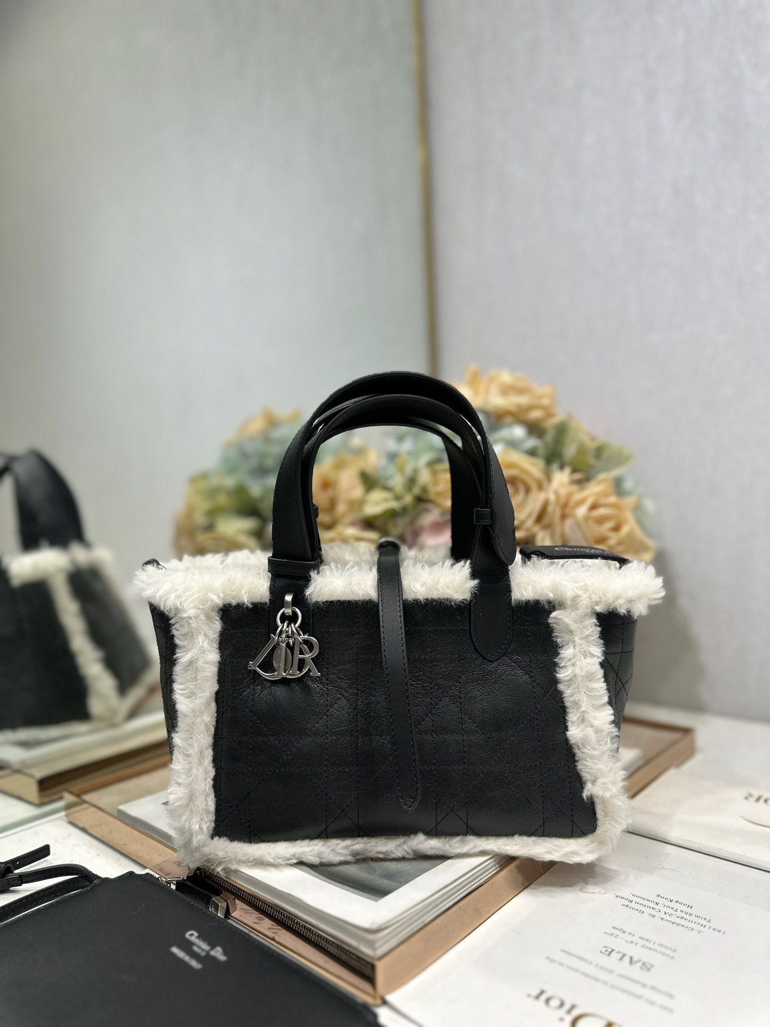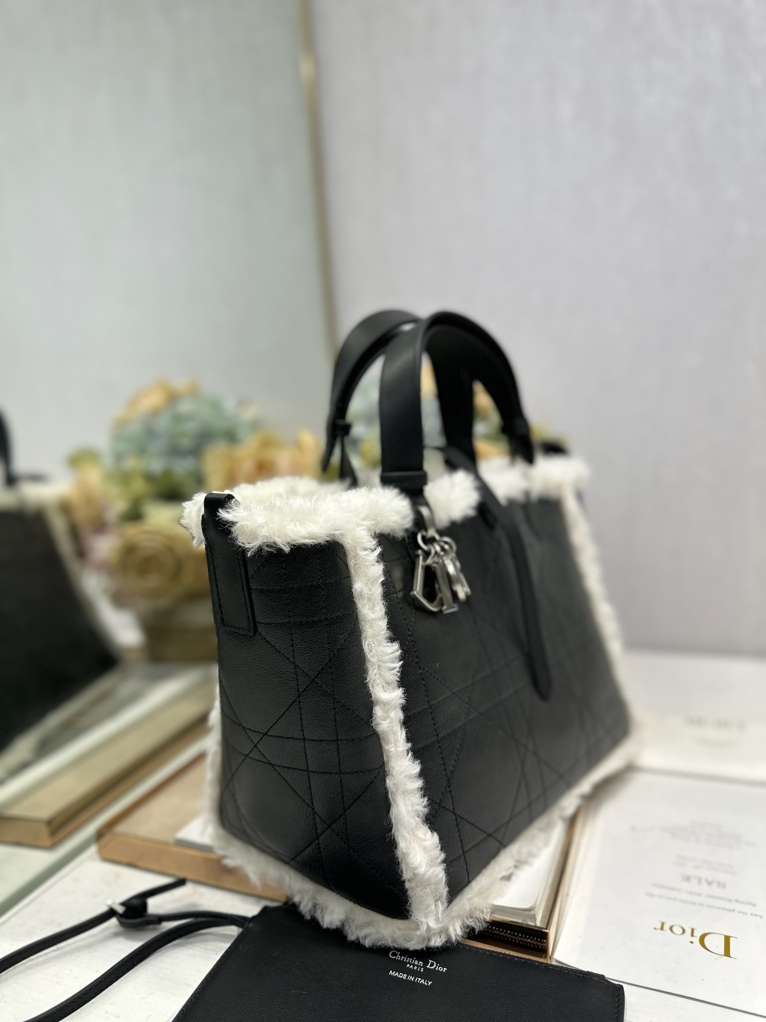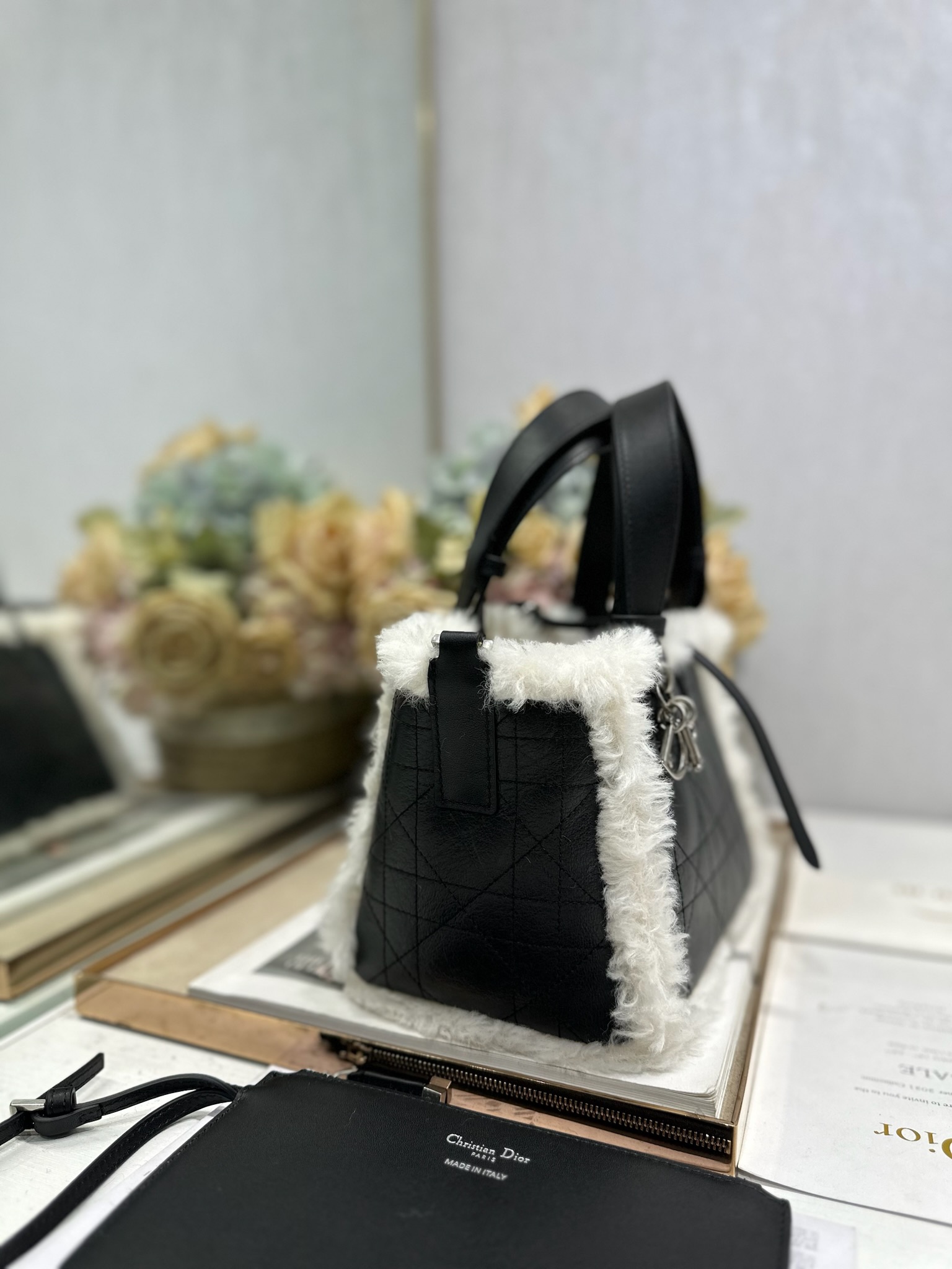 Dior Toujours Handbag (Large, Medium, Small) "Grey/Black Cracked Leather with White Trim" - Black cracked calfskin and white goat hair, Model: 1188