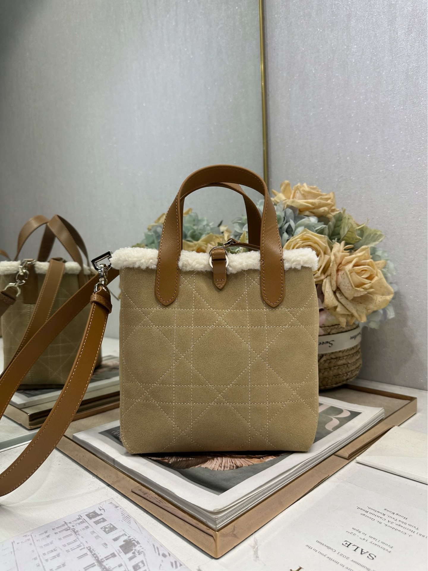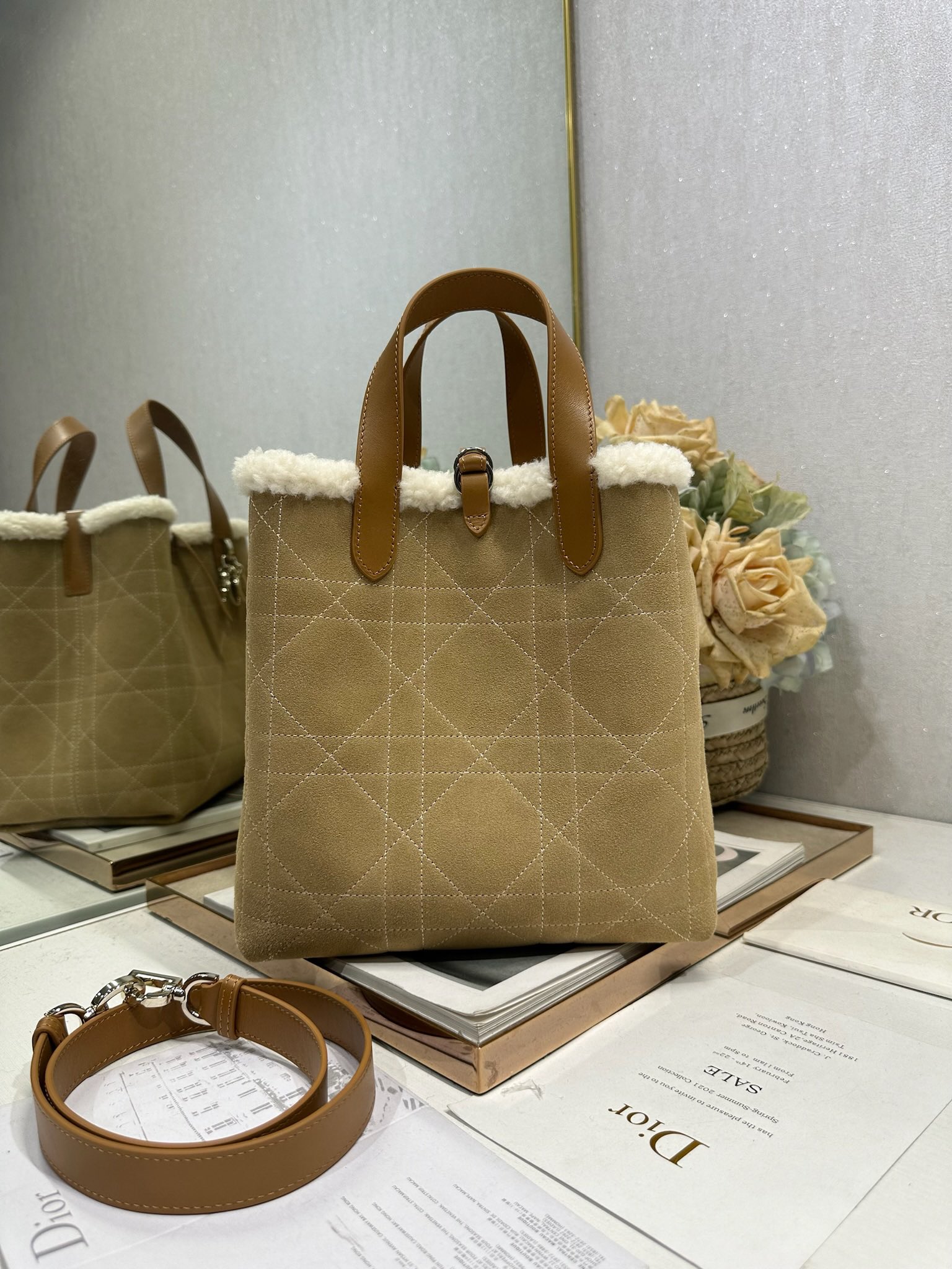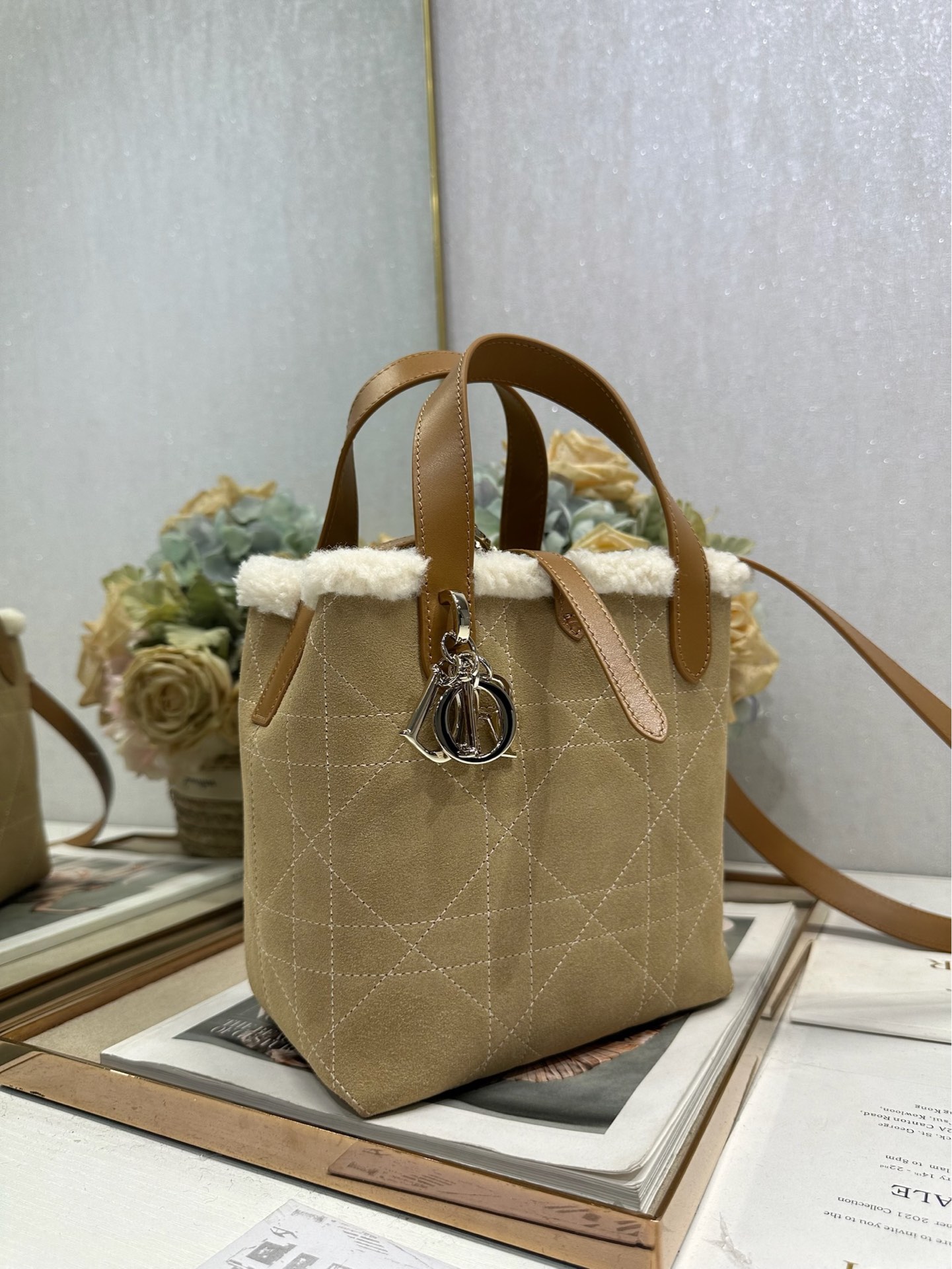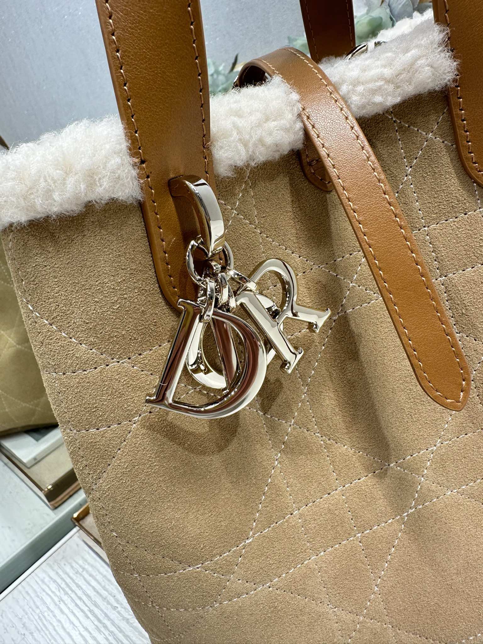 This Dior Toujours vertical handbag, from the DiorAlps limited edition collection, is stylish, practical, and unique. Crafted from beige distressed suede calfskin with oversized cannage stitching and paired with off-white wool, it showcases Dior's exceptional craftsmanship. The spacious interior compartments can hold various everyday essentials. It features a slim leather strap closure for secure storage and a CD Lock D-shaped knob buckle for adjustable sides to accentuate the silhouette. The medium size comes with a top leather handle and a detachable leather shoulder strap, allowing for hand-carrying, shoulder-carrying, or crossbody wear. It can also be easily paired with other DiorAlps items to create coordinated looks.