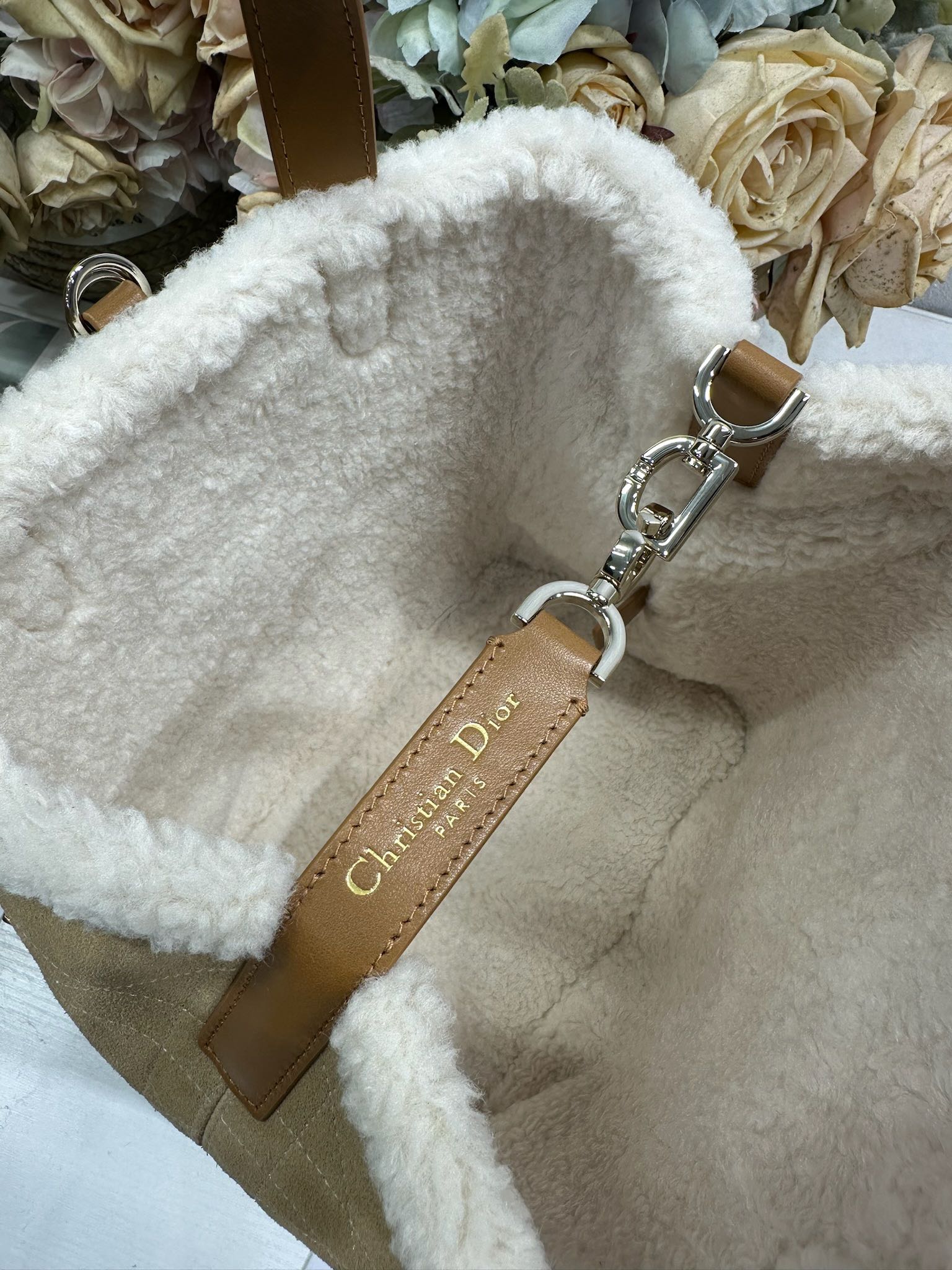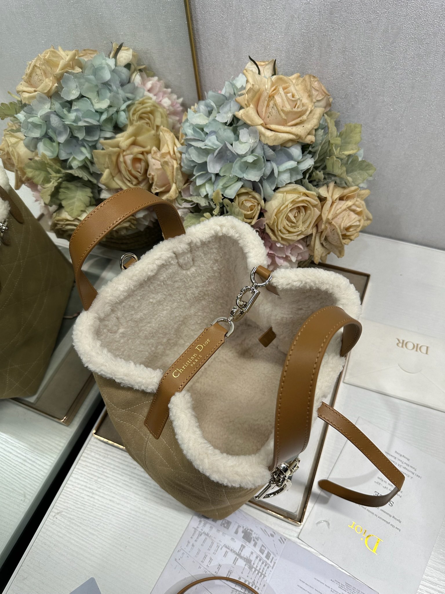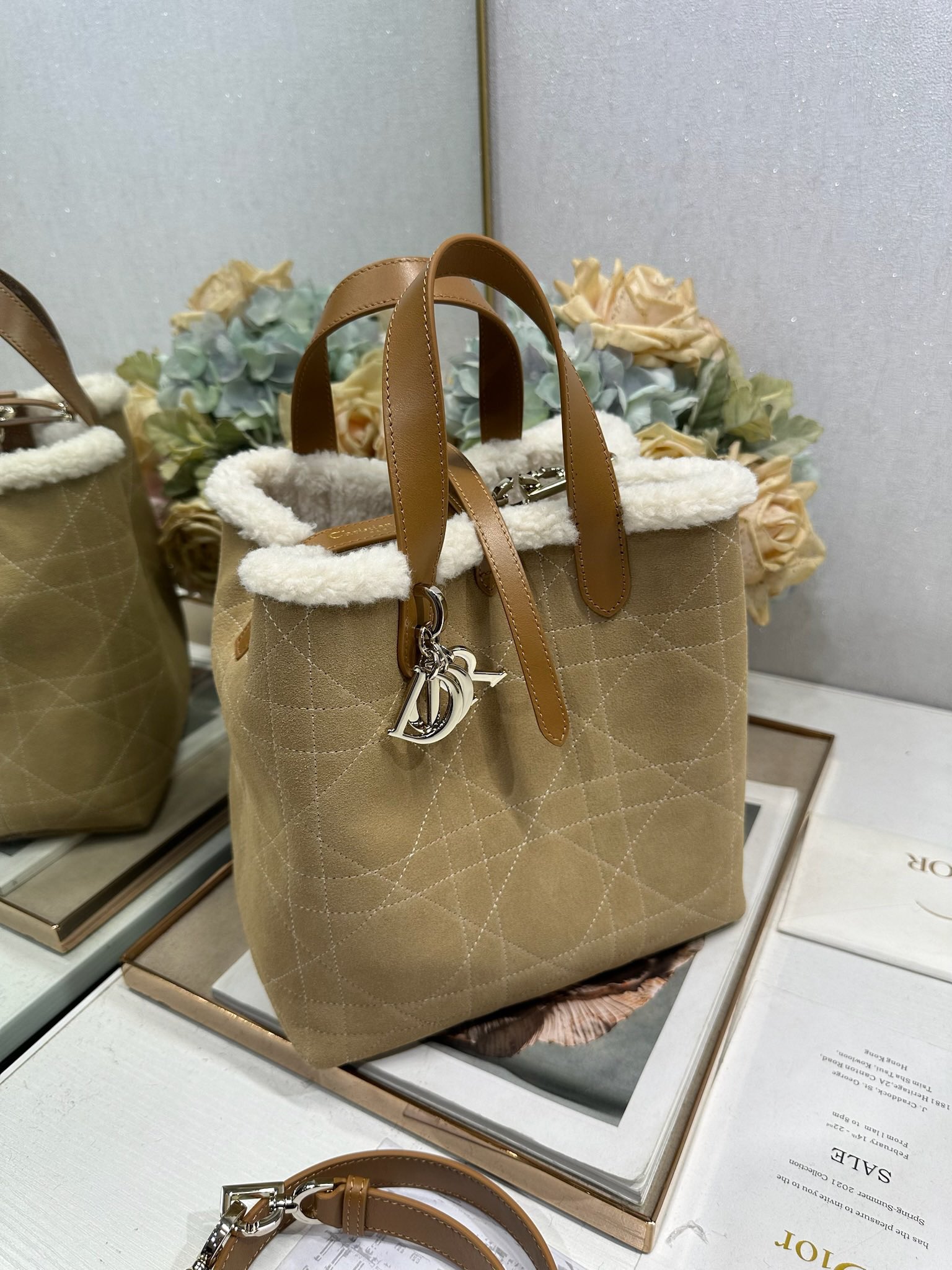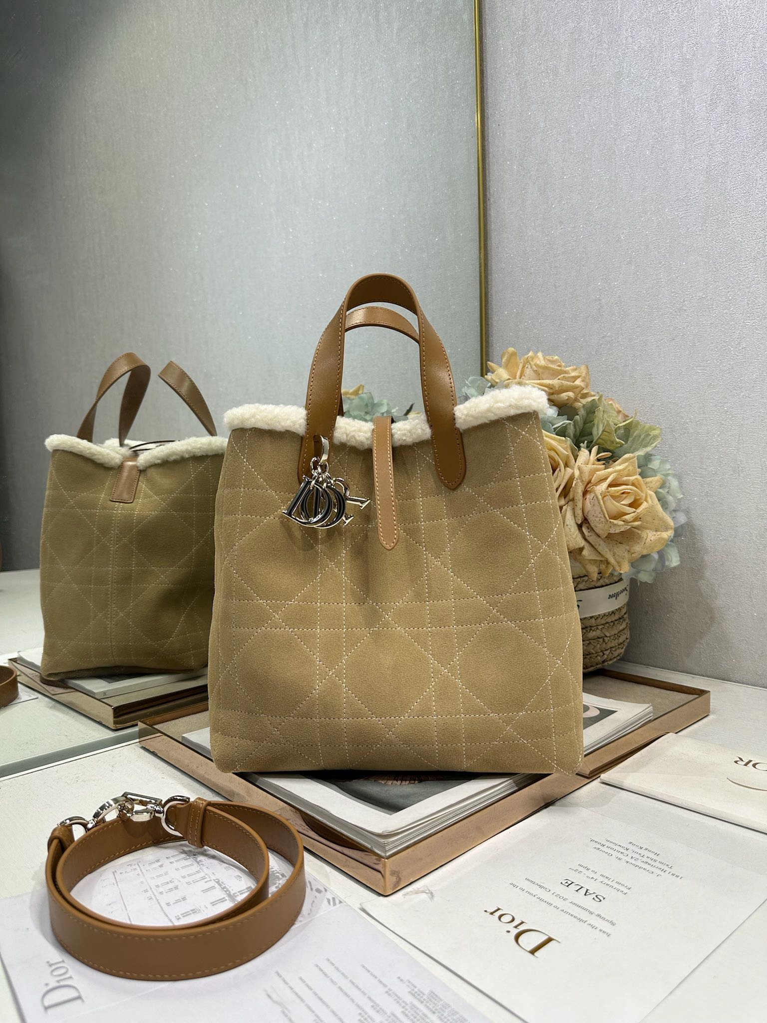 This Dior Toujours vertical handbag, from the DiorAlps limited edition collection, is stylish, practical, and unique. Crafted from beige distressed suede calfskin with oversized cannage stitching and paired with off-white wool, it showcases Dior's exceptional craftsmanship. The spacious interior compartments can hold various everyday essentials. It features a slim leather strap closure for secure storage and a CD Lock D-shaped knob buckle for adjustable sides to accentuate the silhouette. The medium size comes with a top leather handle and a detachable leather shoulder strap, allowing for hand-carrying, shoulder-carrying, or crossbody wear. It can also be easily paired with other DiorAlps items to create coordinated looks.