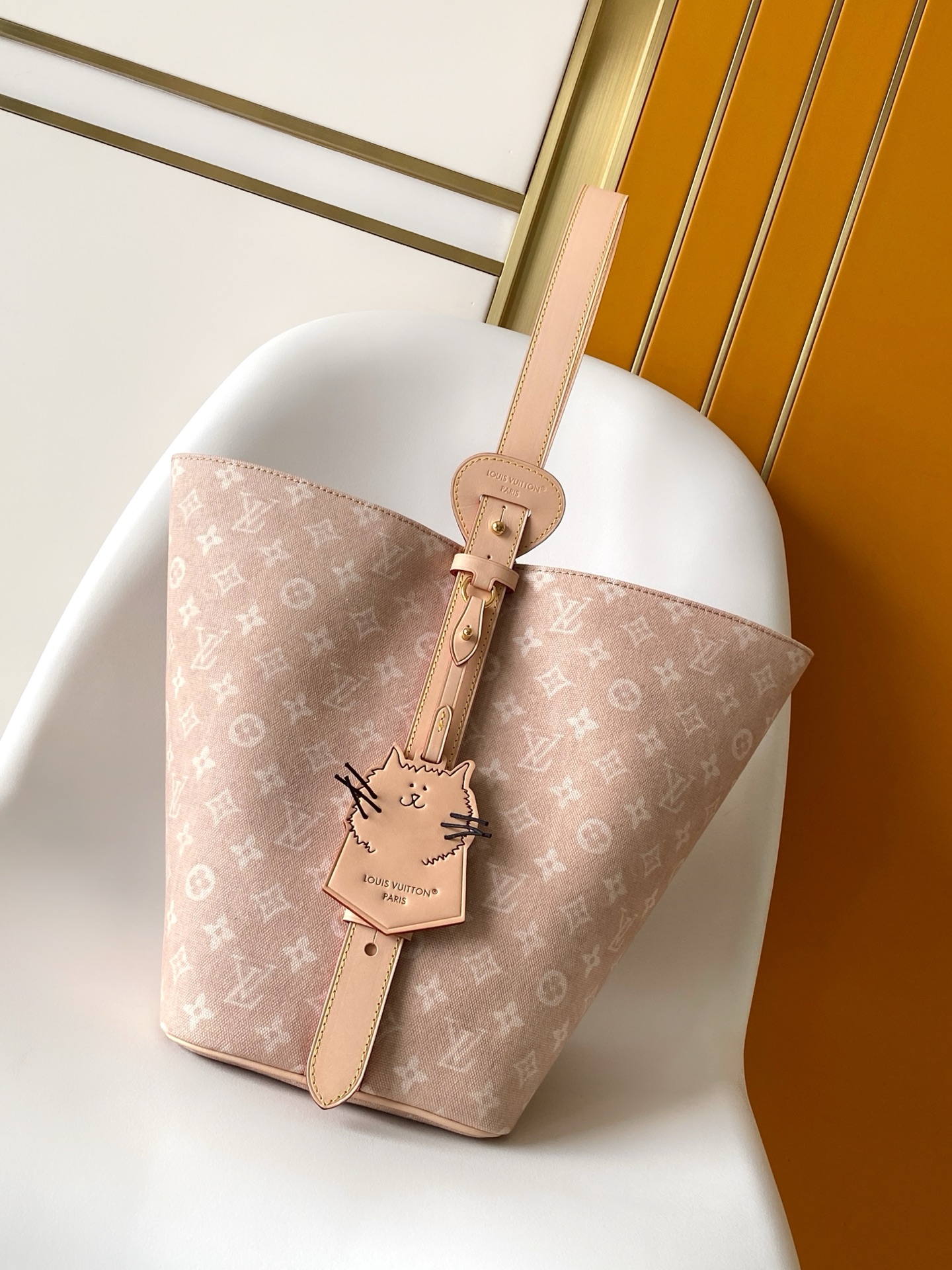 Showcasing the design aesthetics of fashion icon and artist Grace Coddington with the Meowgram pattern. The canvas body is accented with calfskin leather trim and a playful cat-shaped key pouch. The bucket shape easily accommodates everyday essentials such as a laptop, while a detachable zippered pocket adds further functionality. Meowgram coated canvas – Calfskin leather trim – Textile lining – Hardware – Magnetic and hook closure – Detachable zippered interior pocket – Detachable cat-shaped key pouch – Holds a laptop, smartphone, earphones, Zipy wallet, and keys – Shoulder strap: Non-detachable, adjustable!!