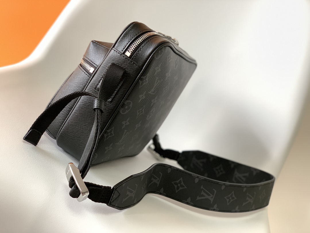 The fusion of Taïga leather and Monogram canvas adds a harmonious touch to the bold design of this outdoor messenger bag. Exquisite details are accentuated by the silver zipper and metal hardware on the front, while the adjustable shoulder strap ensures a comfortable carrying experience. - Taïga calfskin and Monogram Eclipse coated canvas - Calfskin trim - Fabric lining - Silver-tone hardware - Adjustable fabric and leather shoulder strap - Central zippered compartment with interior slip pocket - Zipped front pocket - Buckle - Size 25.5*5*18 (cm)