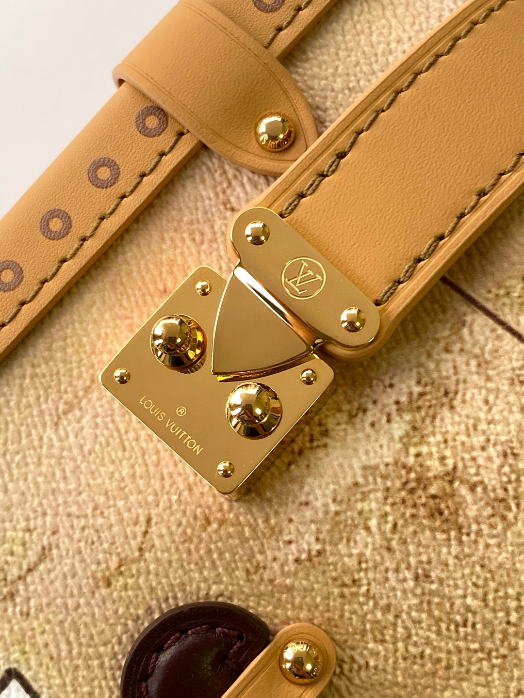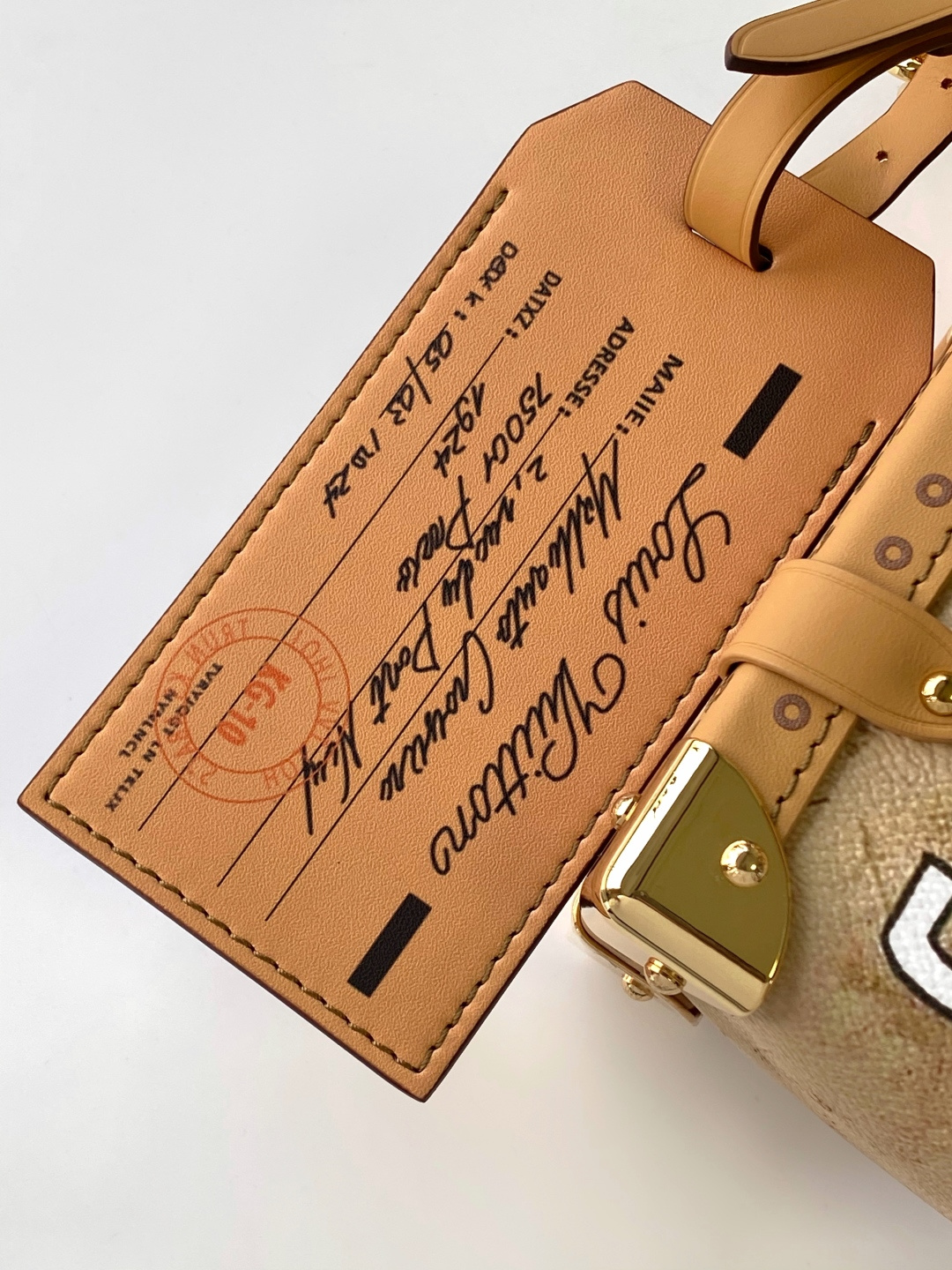 Crafted from canvas and smooth leather, this bag features high-definition printing and marquetry that create an optical illusion of classic details. The collector's edition label highlights the trunk information that inspired its design. 23.5 x 16.0 x 8.5 cm (Length x Height x Width)