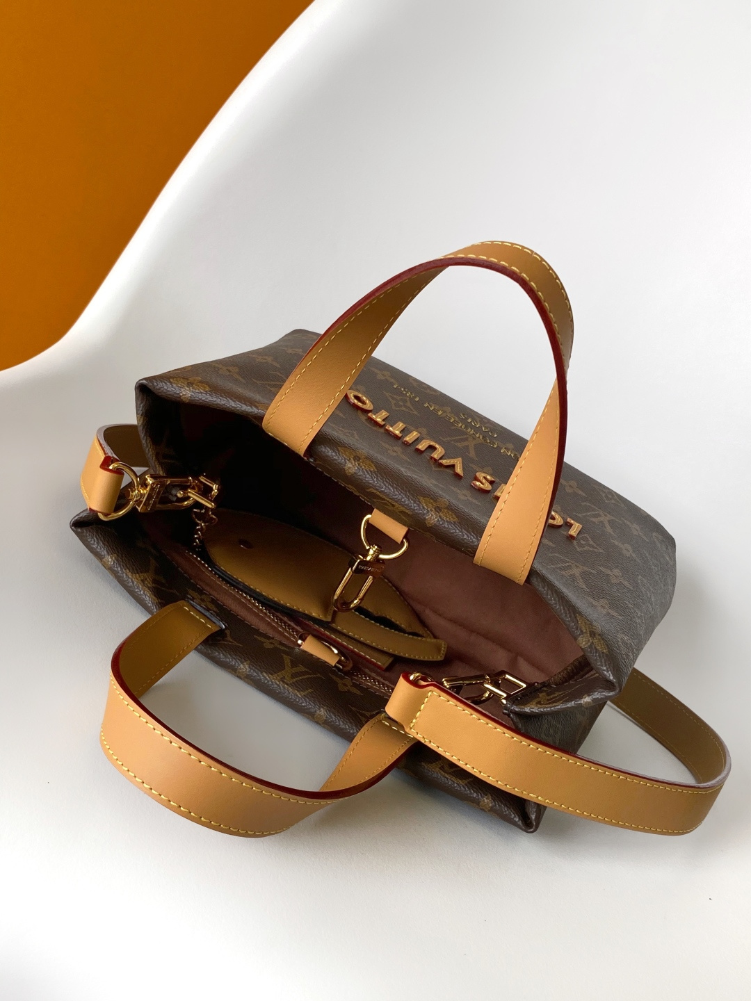 This Shopper medium handbag from the collection's collaboration draws inspiration from Louis Vuitton tote bags, featuring the Louis Vuitton and Maison Fondée En 1854 logos on supple calfskin leather, top handle, and detachable shoulder strap.