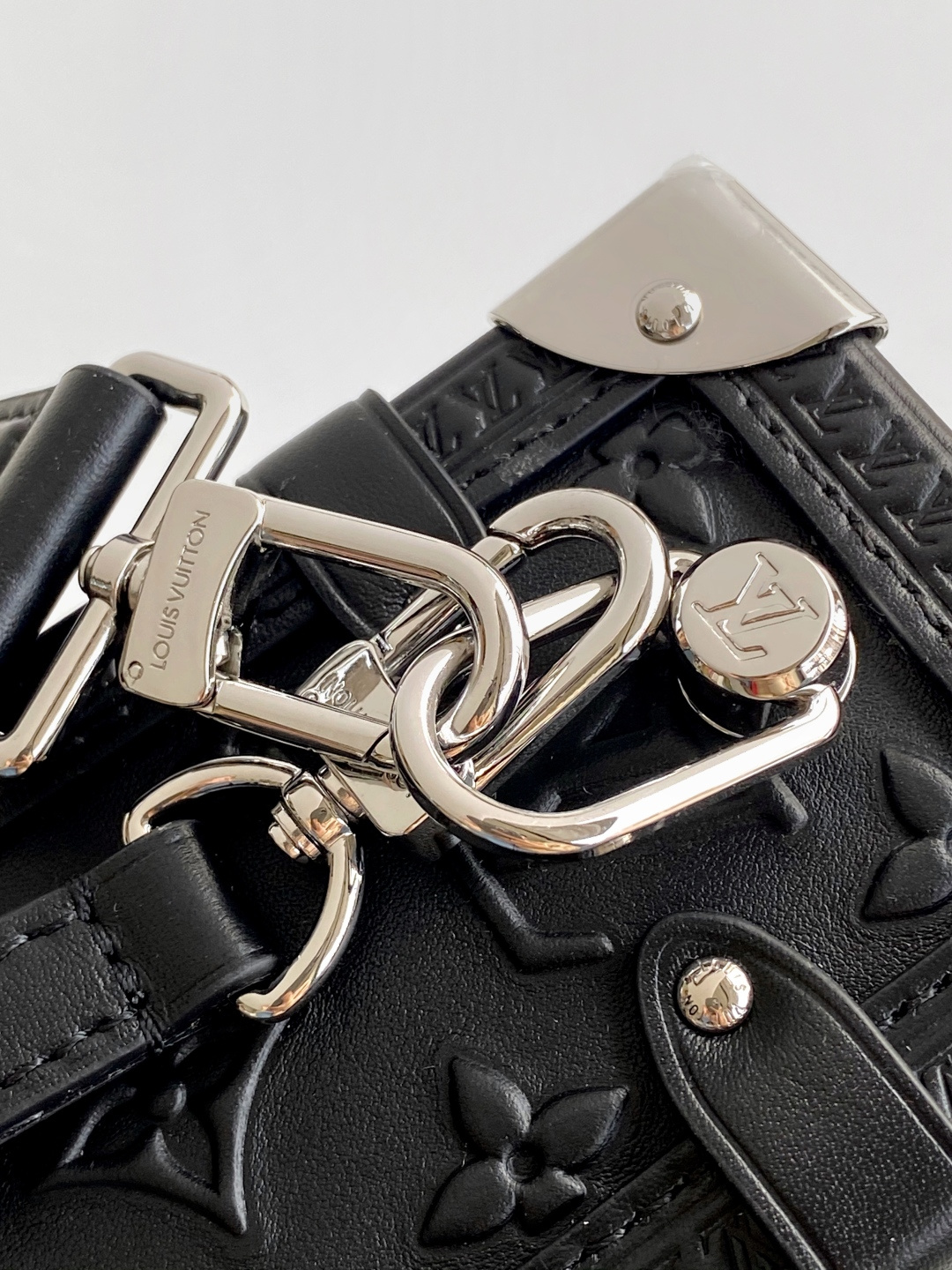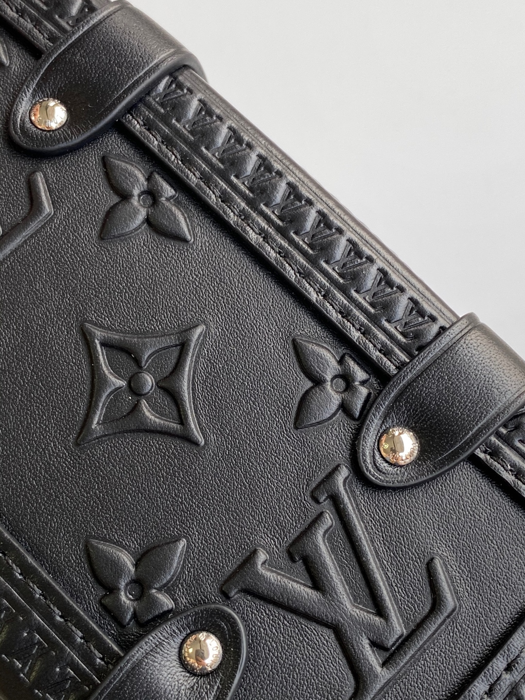 From the Monogram Bold collection, this bag showcases Artistic Director Nicolas Ghesquière's creative interpretation of Louis Vuitton's classic trunk. The smooth calfskin leather body is embossed with the Monogram pattern, while metal corner protectors and an S-lock clasp highlight the signature design. A detachable long shoulder strap allows for flexible carrying. 23.5 x 16.0 x 8.5 cm (Length x Height x Width)