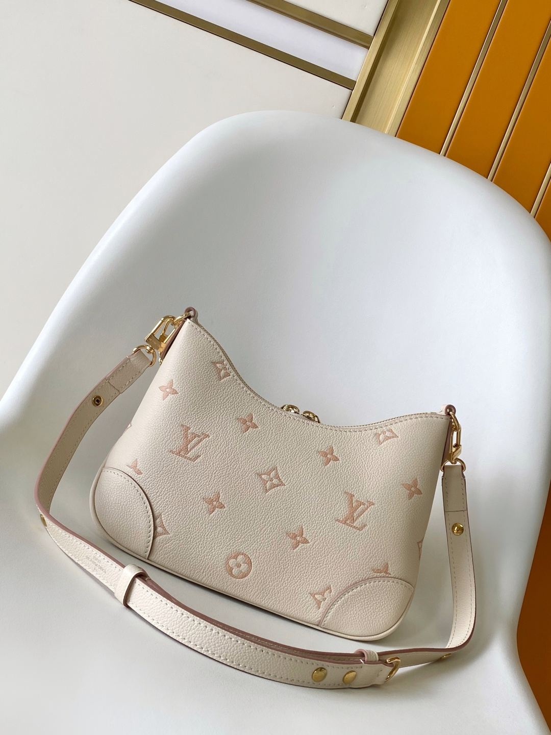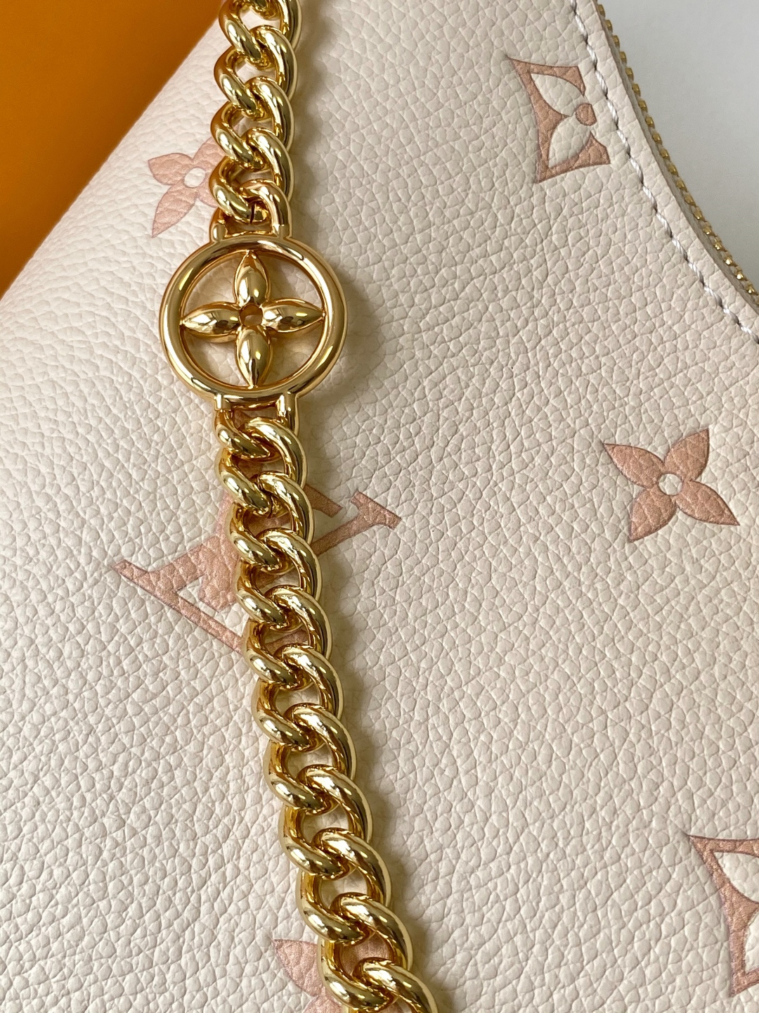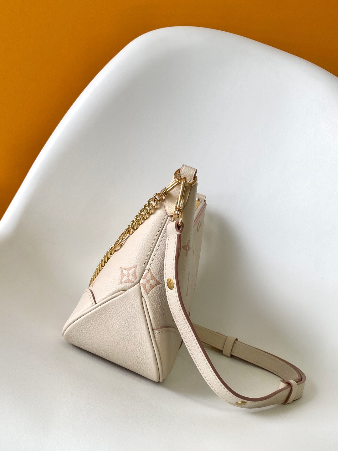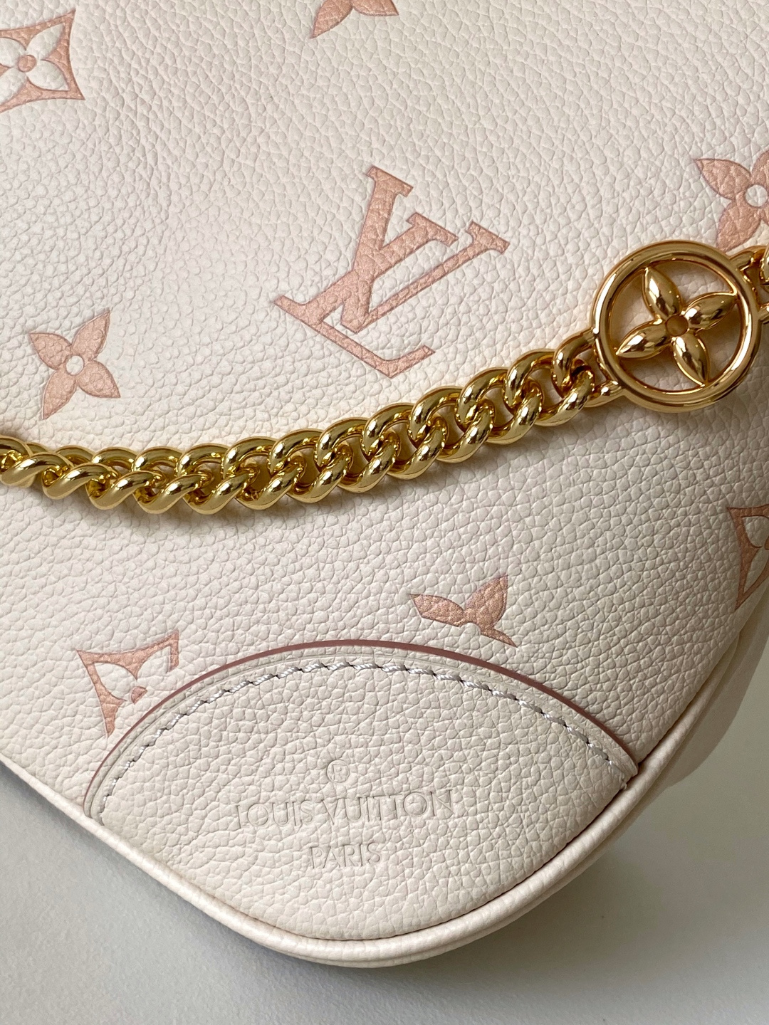 Reinterpreting the classic Monogram Empreinte leather with a tonal aesthetic, this bag is infused with elegant luster by a detachable chain and LV floral embellishments. Its clever design allows for multiple carrying options, and the interior slip pocket easily accommodates a smartphone. Features include: embossed grain calfskin leather, calfskin leather trim, striped fabric lining, metal hardware, drawstring closure, zip closure, interior slip pocket, pocket for smartphone, keys, Victorine wallet, and earphones, and a detachable, adjustable shoulder strap. Model: M14634; Dimensions: 29 x 16 x 9.5 cm