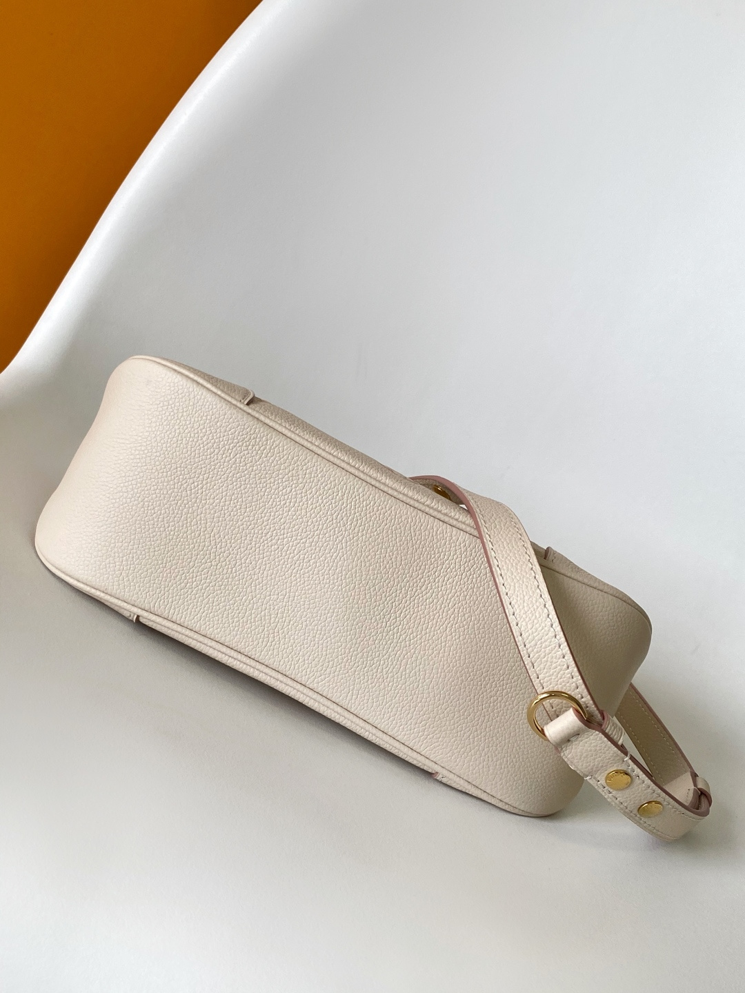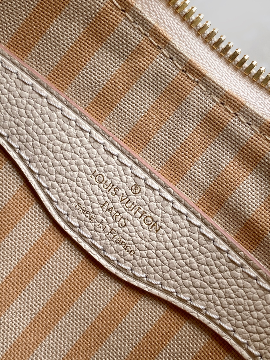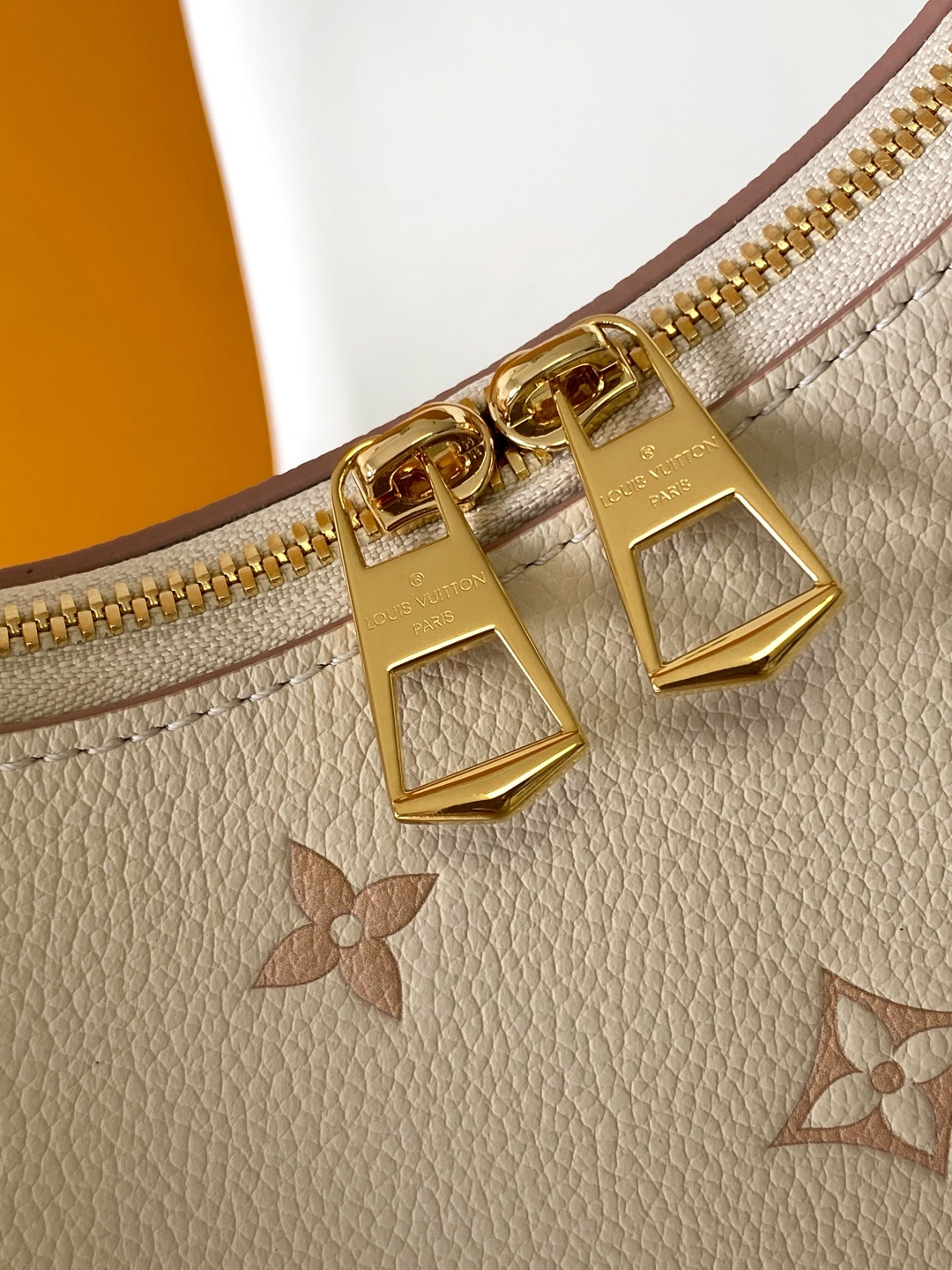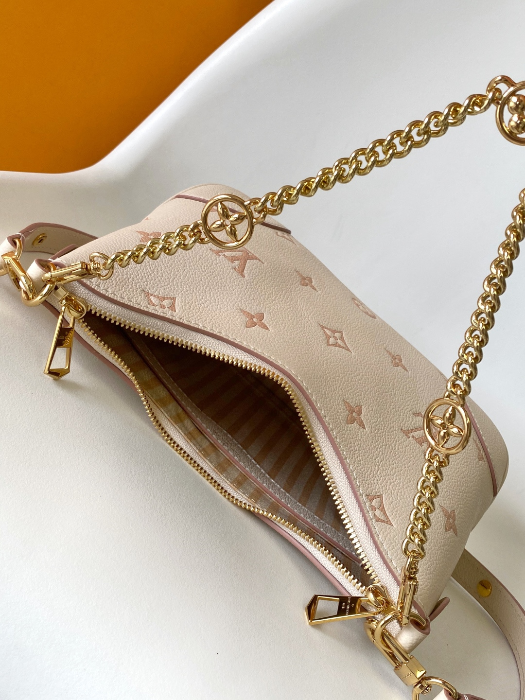 Reinterpreting the classic Monogram Empreinte leather with a tonal aesthetic, this bag is infused with elegant luster by a detachable chain and LV floral embellishments. Its clever design allows for multiple carrying options, and the interior slip pocket easily accommodates a smartphone. Features include: embossed grain calfskin leather, calfskin leather trim, striped fabric lining, metal hardware, drawstring closure, zip closure, interior slip pocket, pocket for smartphone, keys, Victorine wallet, and earphones, and a detachable, adjustable shoulder strap. Model: M14634; Dimensions: 29 x 16 x 9.5 cm