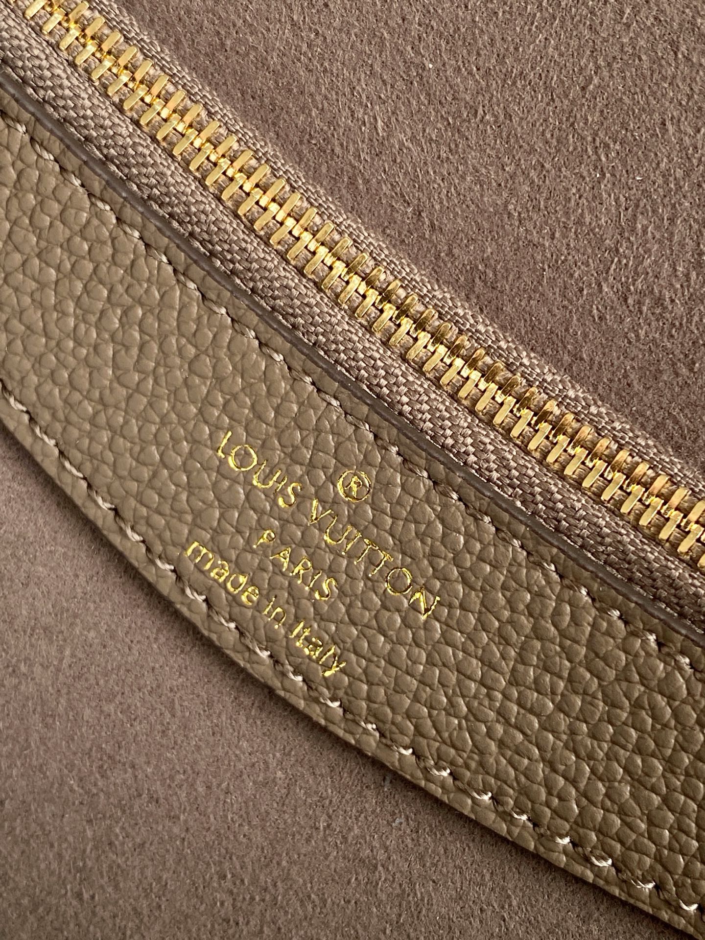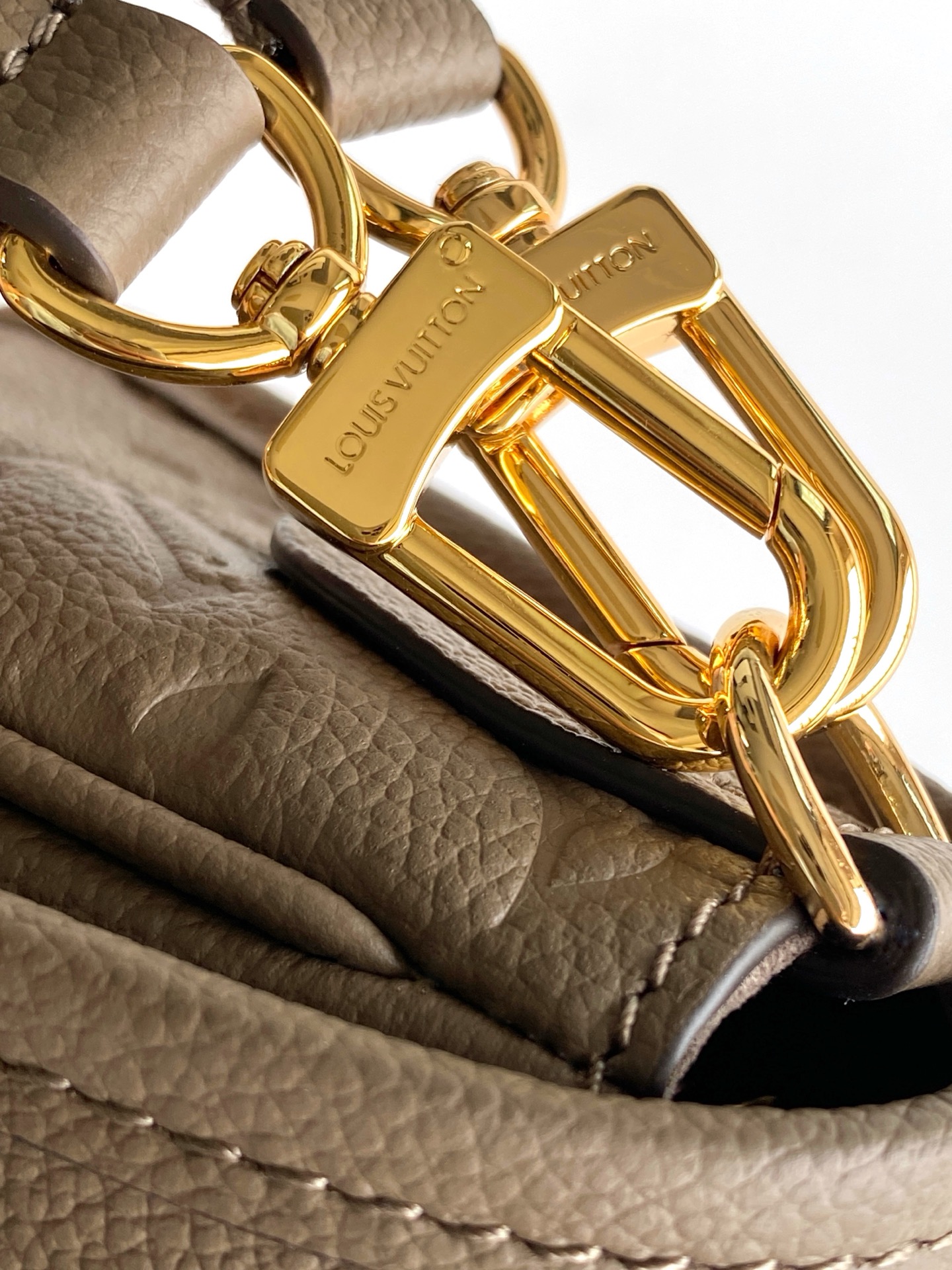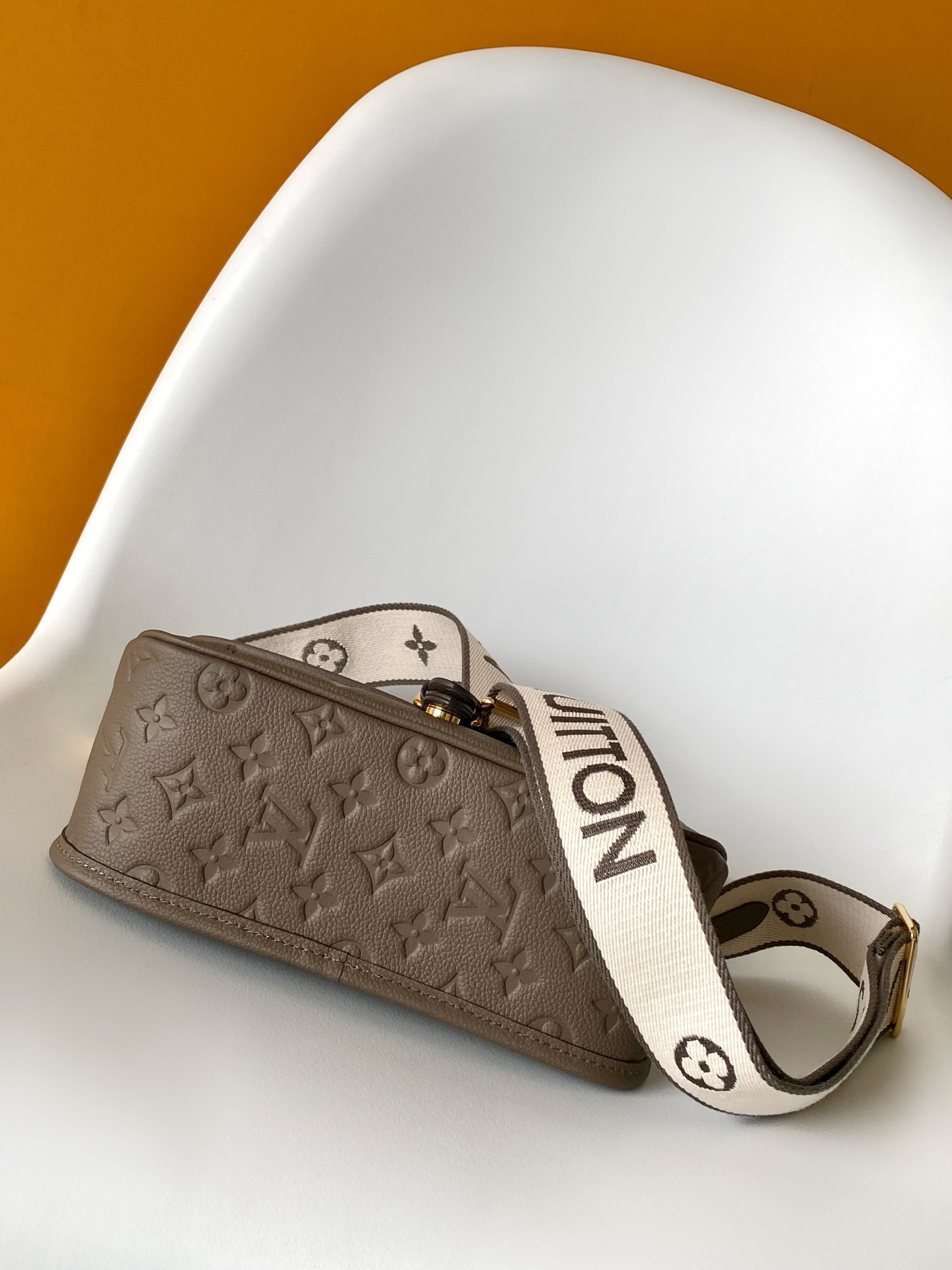 Crafted from Louis Vuitton's classic Monogram Empreinte embossed leather, the brand logo is woven into the detachable wide jacquard shoulder strap. In addition to the detachable leather shoulder strap, a crossbody option is also available, flexibly suiting both elegant and dynamic styles. Dimensions: 23 × 16 × 8.5 cm
