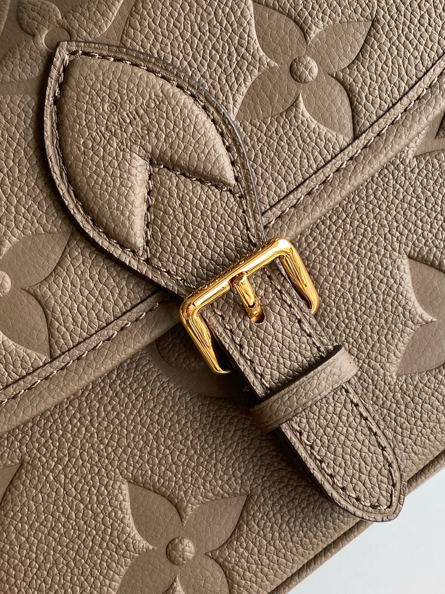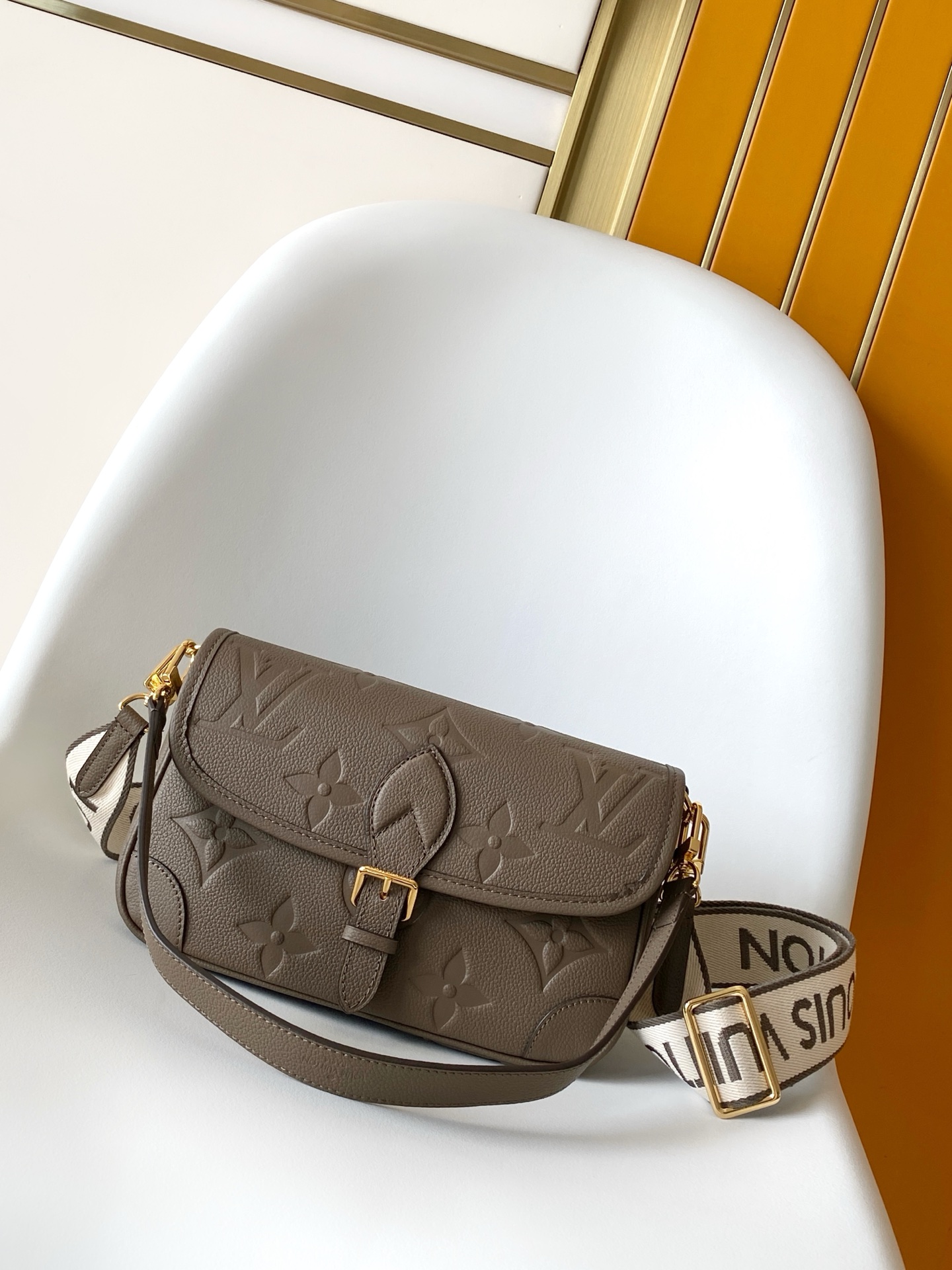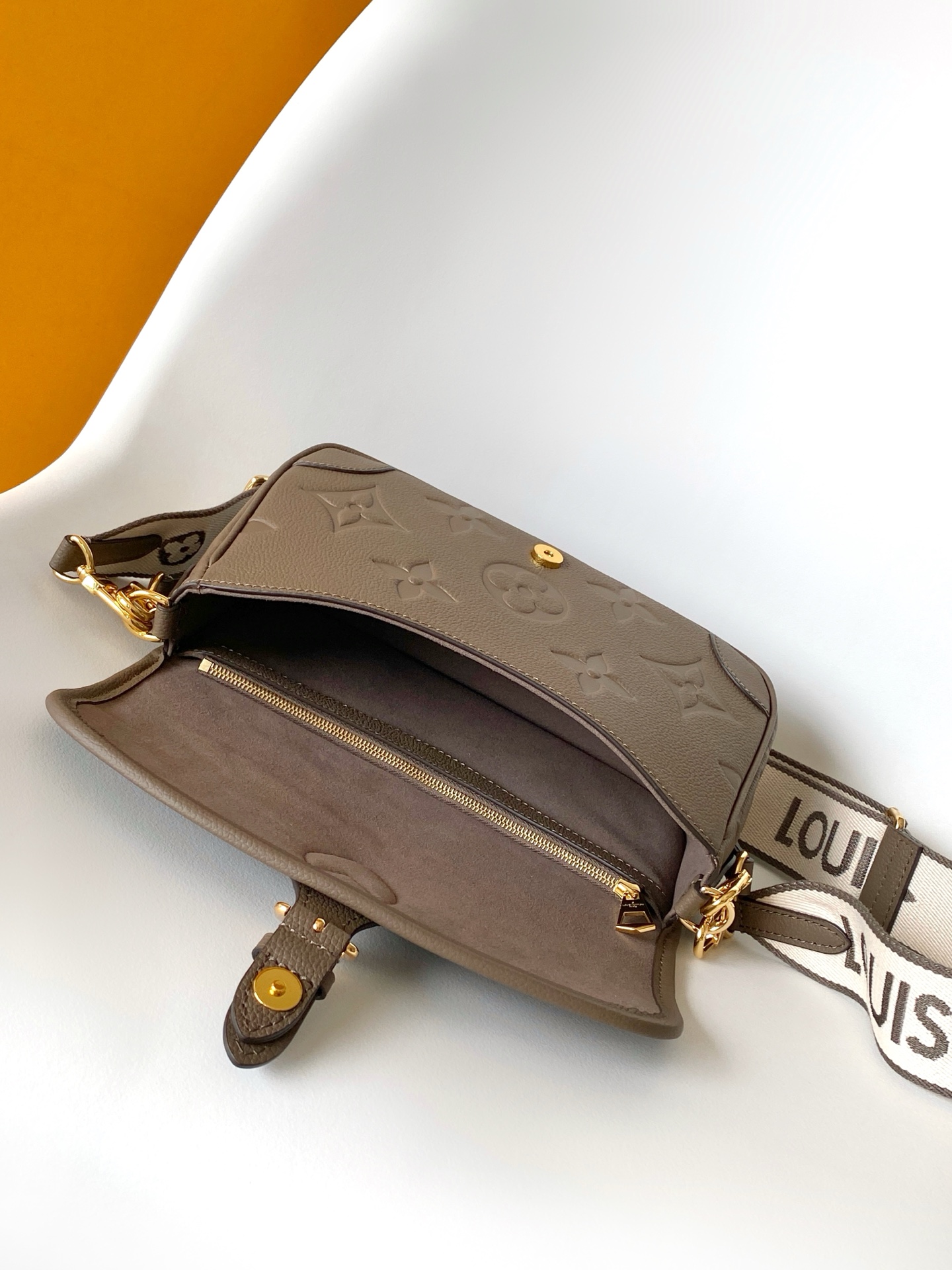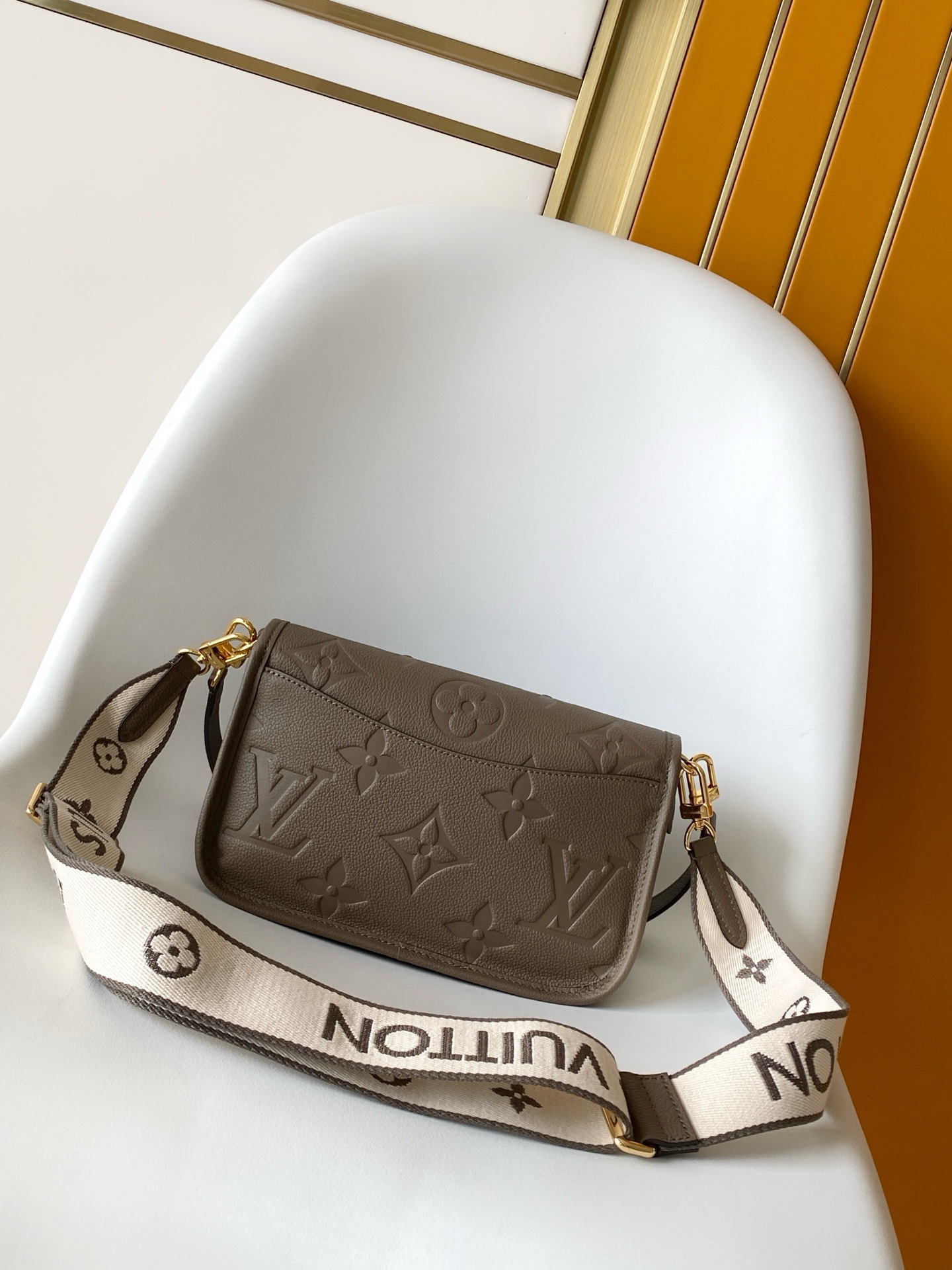 Crafted from Louis Vuitton's classic Monogram Empreinte embossed leather, the brand logo is woven into the detachable wide jacquard shoulder strap. In addition to the detachable leather shoulder strap, a crossbody option is also available, flexibly suiting both elegant and dynamic styles. Dimensions: 23 × 16 × 8.5 cm