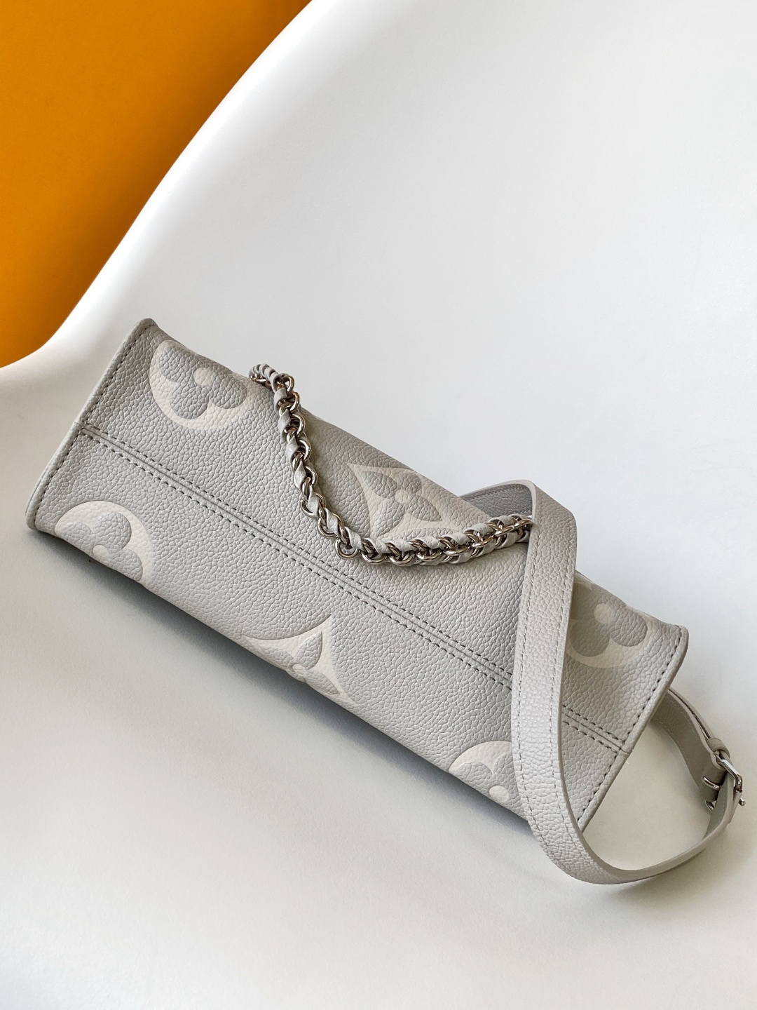 The Monogram leather is embossed with the Giant Monogram pattern, highlighting a soft, elongated silhouette. The compact interior neatly organizes everyday essentials, while the articulated top handle and detachable leather-woven chain shoulder strap offer multiple carrying options. 25.0 x 13.0 x 10.0 cm (Length x Height x Width)