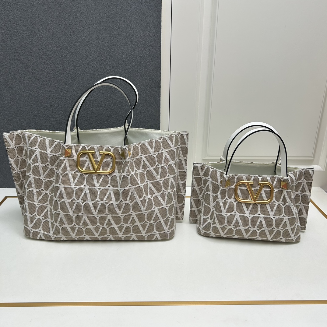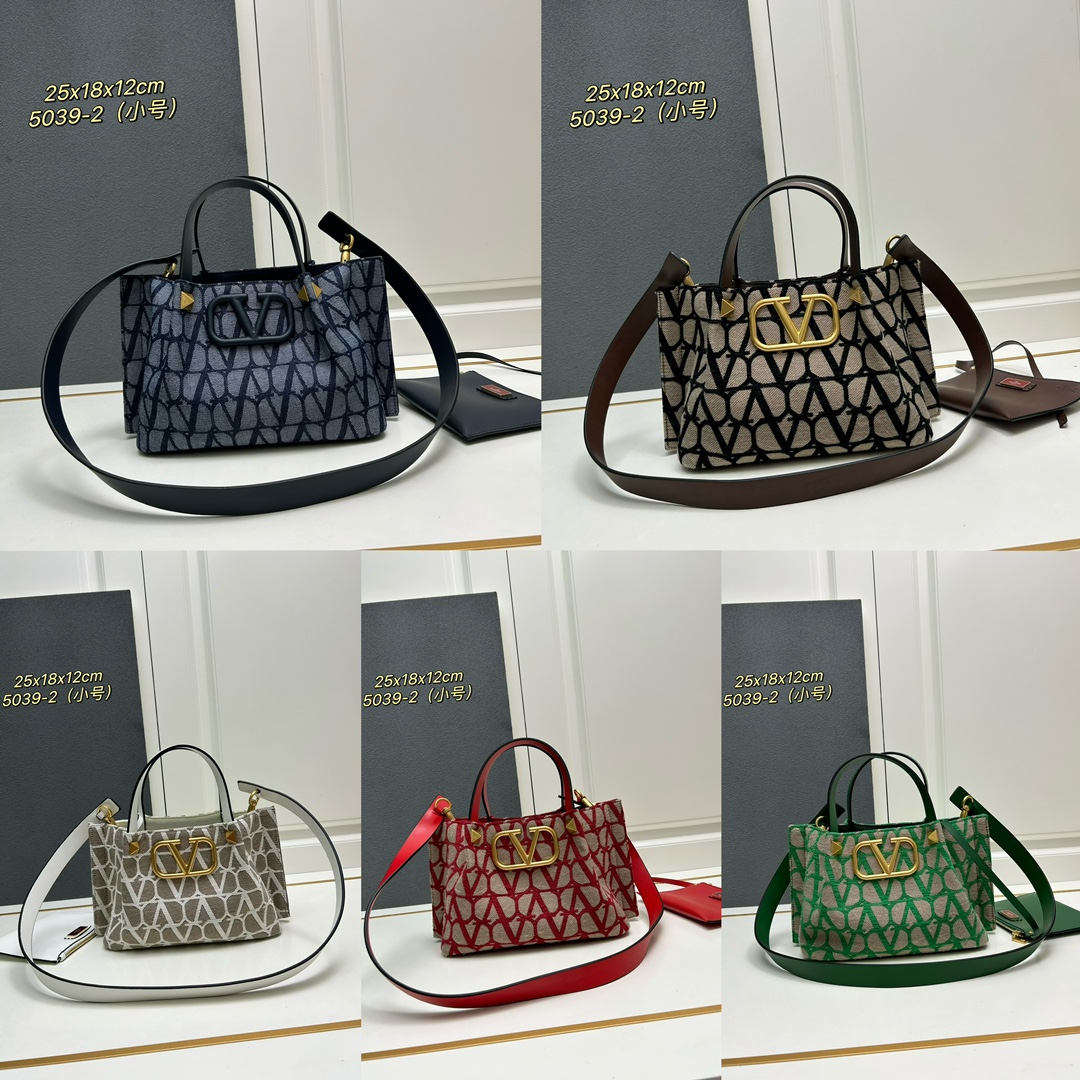 Valentino Garavani V3D Embroidered Fabric Tote Bag/Handbag, Style No. 5039-2 (Small), Style No. 5039 (Large). Available in Green, Black & Gold, Blue, Grey, and Red & Gold.